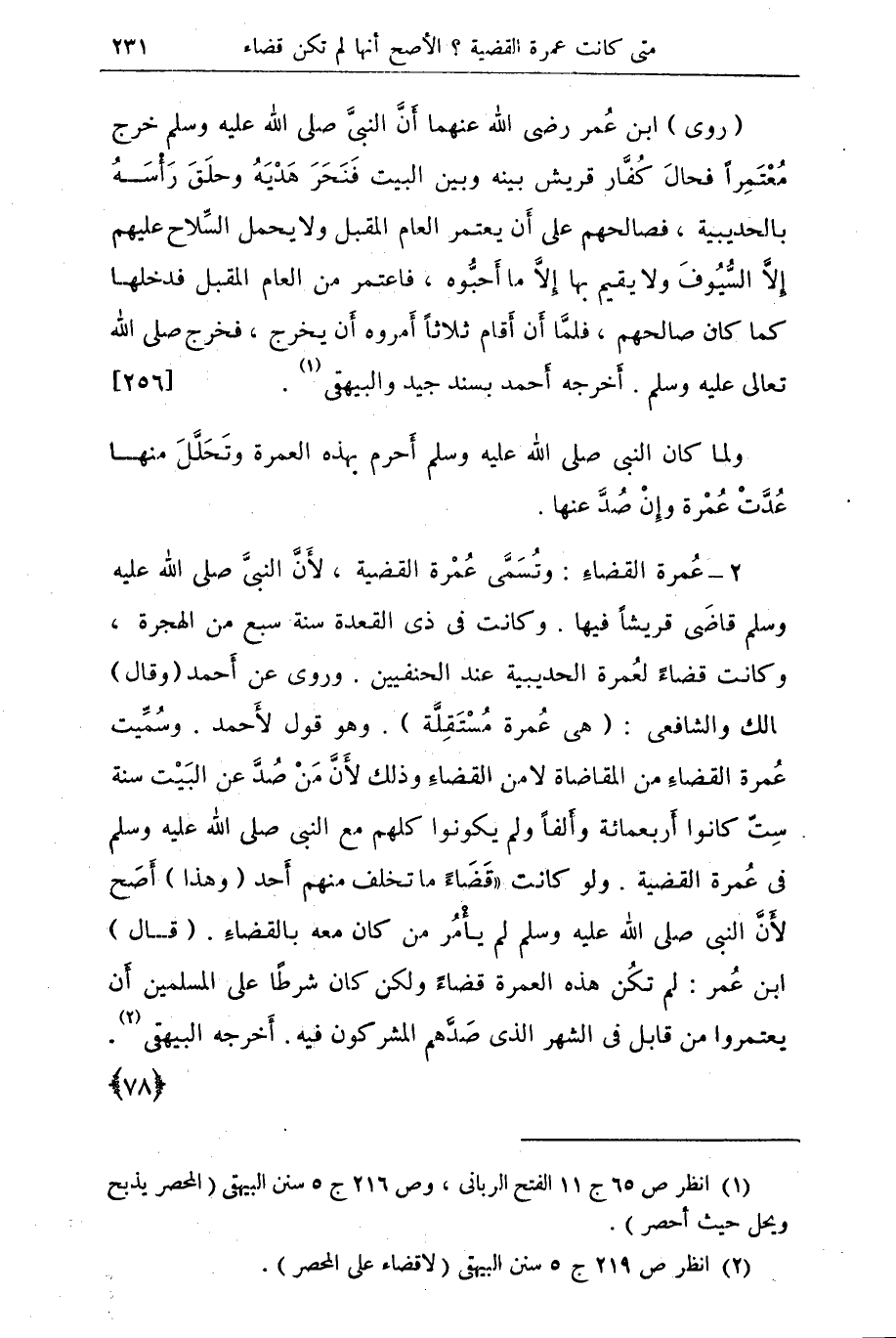 2 - عُمرة القضاءِ: وتُسَمَّى عُمْرة القضية، لأَنَّ النبيَّ صلى الله عليه وسلم قاضَى قريشاً فيها. وكانت في ذِي القعدة سنة سبع من الهجرة، وكانت قضاءً لعُمرة الحديبية عند الحنفيين. وروى عن أَحمد (وقال) مالك والشافعي: (هي عُمرة مُسْتَقِلَّة). وهو قول لأَحمد. وسُمِّيت عُمرة القضاءِ من المقاضاة لا من القضاءِ وذلك لأَنَّ مَنْ صُدَّ عن البَيْت سنة سِتٌ كانوا أَربعمائة وأَلفاً ولم يكونوا كلهم مع النبي صلى عليه وسلم في عُمرة القضية. ولو كانت قَضَاءً ما تخلف منهم أَحد (وهذا) أَصَح لأَنَّ النبي صلى الله عليه وسلم لم يأْمُر من كان معه بالقضاءِ. (قال) ابن عُمر: لم تكُن هذه العمرة قضاءً ولكن كان شرطًا على المسلمين أَن يعتمروا من قابل في الشهر الذي صَدَّهم المشركون فيه. أَخرجه البيهقي (¬2). {78}