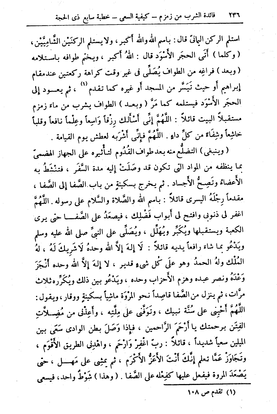 (وينبغي) التضلُّع منه بعد طواف القُدُوم لتأْثيره على الجهاز الهضميّ بما ينظفه من المواد التي تكون قد وصَلَتْ إِليه مدة السَّفَر، فتنْشَطُ به الأَعضاءُ وتَصِحُّ الأَجساد. ثم يخرج بسكينةٍ من باب الصَّفا إِلى الصَّفا، مقدماً رِجْلَهُ اليسرى قائلاً: باسم الله والصَّلاة والسَّلام عل رسوله. اللَّهُمَّ اغفر لي ذنوبي وافتح لي أَبواب فَضُلِك، فيصعَدُ على الصَّفا حتى يرى الكعبة ويستقبلها ويُكَبِّر ويُهَلِّل، ويُصَلِّى على النبيِّ صلى الله عليه وسلم ويَدْعُو بما شاءَ رافعاً يديه قائلاً: لاَ إلهَ إلاَّ الله وحده أَنْجَزَ وَعْدَهُ ونصر عبده وهزم الأَحزاب وحده، ويَدْعُو بين ذلك ويُكَرِّره ثلاث مرَّات، ثم ينزل من الصَّفا قاصِداً نحو المرْوَة ماشِياً بسكينةٍ ووقار، ويقول: اللَّهُمَّ أَحْيِني على سُنَّة نبيك، وتَوَفَّني على مِلَّتِه، وأَعِذْني من مُضِلاَّتِ الفِتَن برحمتك يا أَرْحَمَ الرَّحمين، فإِذا وَصَلَ بطن الوادي سَعَى بين الميلين سعياً شديداً، قائلاً: ربٌ اغْفِرْ وَارْحَم، واهْدِني الطريق الأَقْوَم، وتَجاَوَزْ عَمَّا تعلم إِنَّكَ أَنْتَ الأَعَزُّ الأَكْرَم، ثم يمشِى على مَهل، حتى يَصْعَدَ المروة فيفعل عليها كفِعْله على الصَّفا. (وهذا) شَوْطٌ واحد، فيسعى