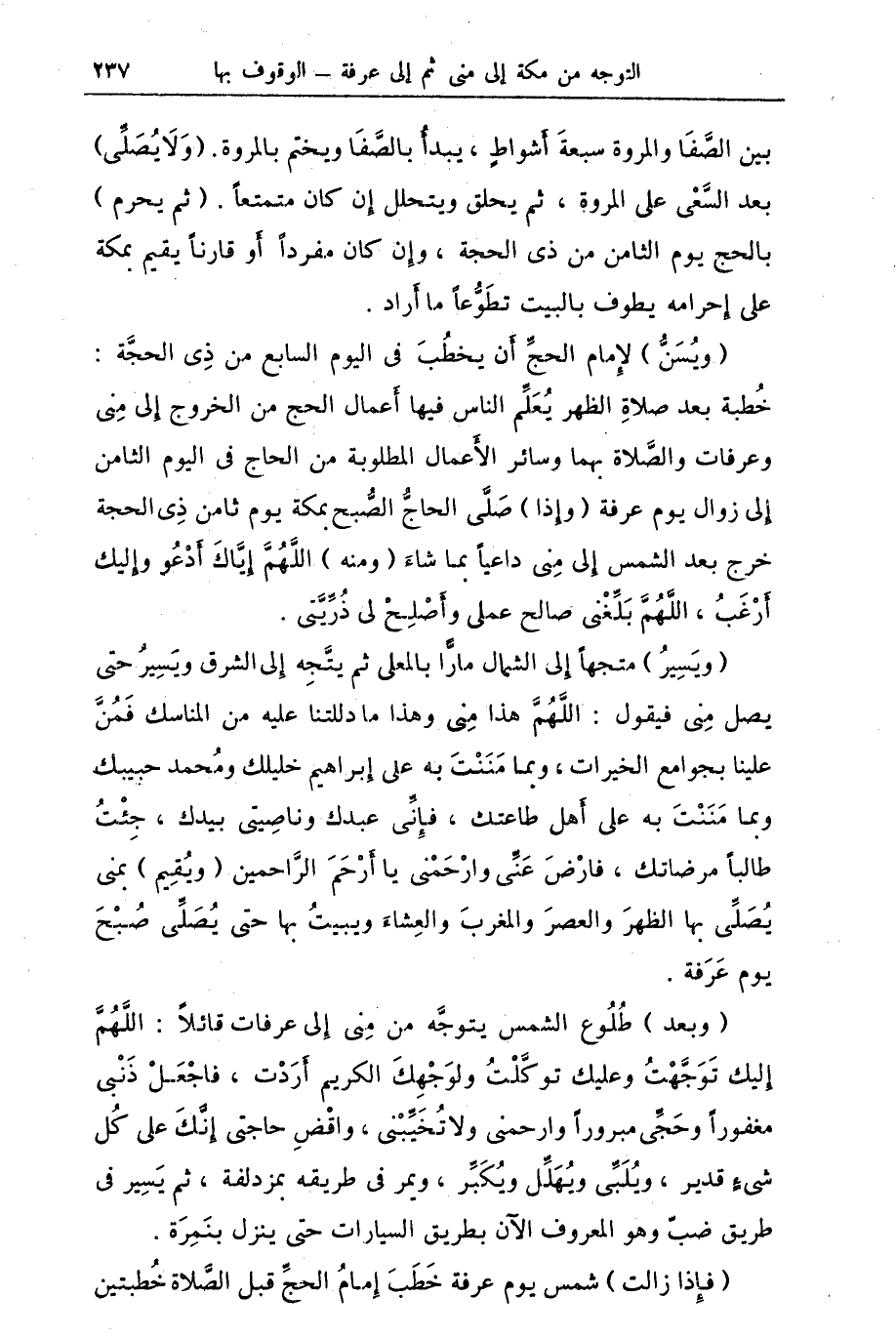 (وبعد) طُلُوع الشمس يتوجَّه من مِنى إِلي عرفات قائلاً: اللَّهُمَّ إِليك تَوَجَّهْتُ وعليك توكَّلْتُ ولوَجْهِكَ الكريم أَرَدْت، فاجْعَلْ ذَنْبي مغفوراً وحَجِّى مبروراً وارحمني ولا تُخَيِّبْني، واقْضِ حاجتي إِنكَ على كُل شيءٍ قدير، ويُلَبِّي ويُهَلِّل ويُكَبِّر، ويمر في طريقه بمزدلفة، ثم يَسِير في طريق ضبً وهو المعروف الآن بطريق السيارات حتى ينزل بنَمِرَة. (فإِذا زالت) شمس يوم عرفة خَطَبَ إِمامُ الحجِّ قبل الصَّلاة خُطبتين