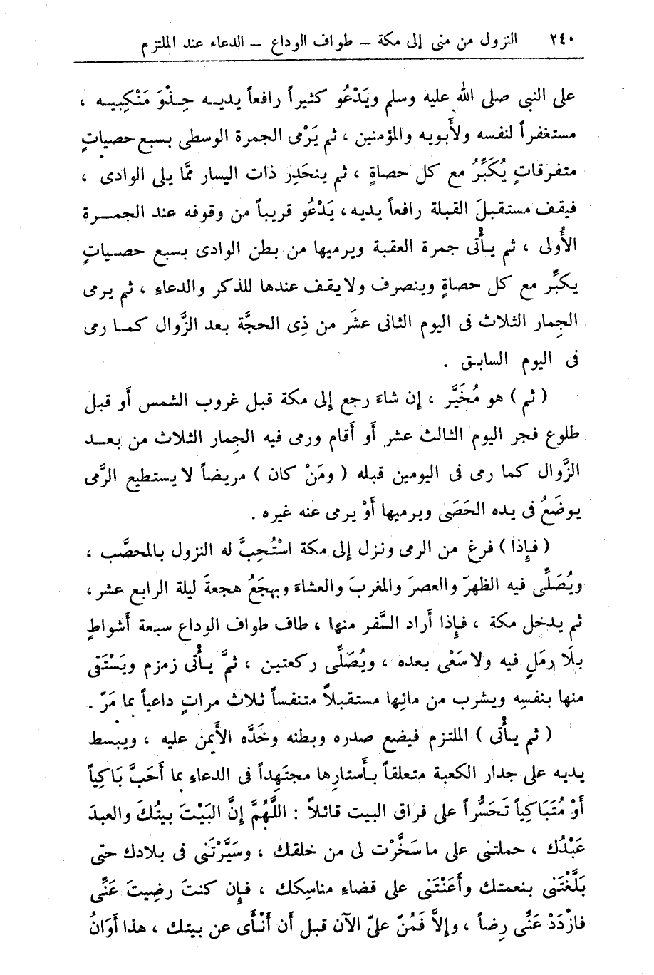 (فإذا) فرغ من الرمي ونزل إلى مكة استحب له النزول بالمحصب، ويصلي فيه الظهر والعصر والمغرب والعشاء ويهجع هجعه ليلة الرابع عشر، ثم يدخل مكة، فإذا أراد السفر منها، طاف طواف الوداع سبعة أشواط بلا رمل فيه ولا سعي بعده، ويصلي ركعتين، ثم يأتي زمزم ويستقي منها بنفسه ويشرب من مائها مستقبلا متنفسا ثلاث مرات داعيا بما مر.