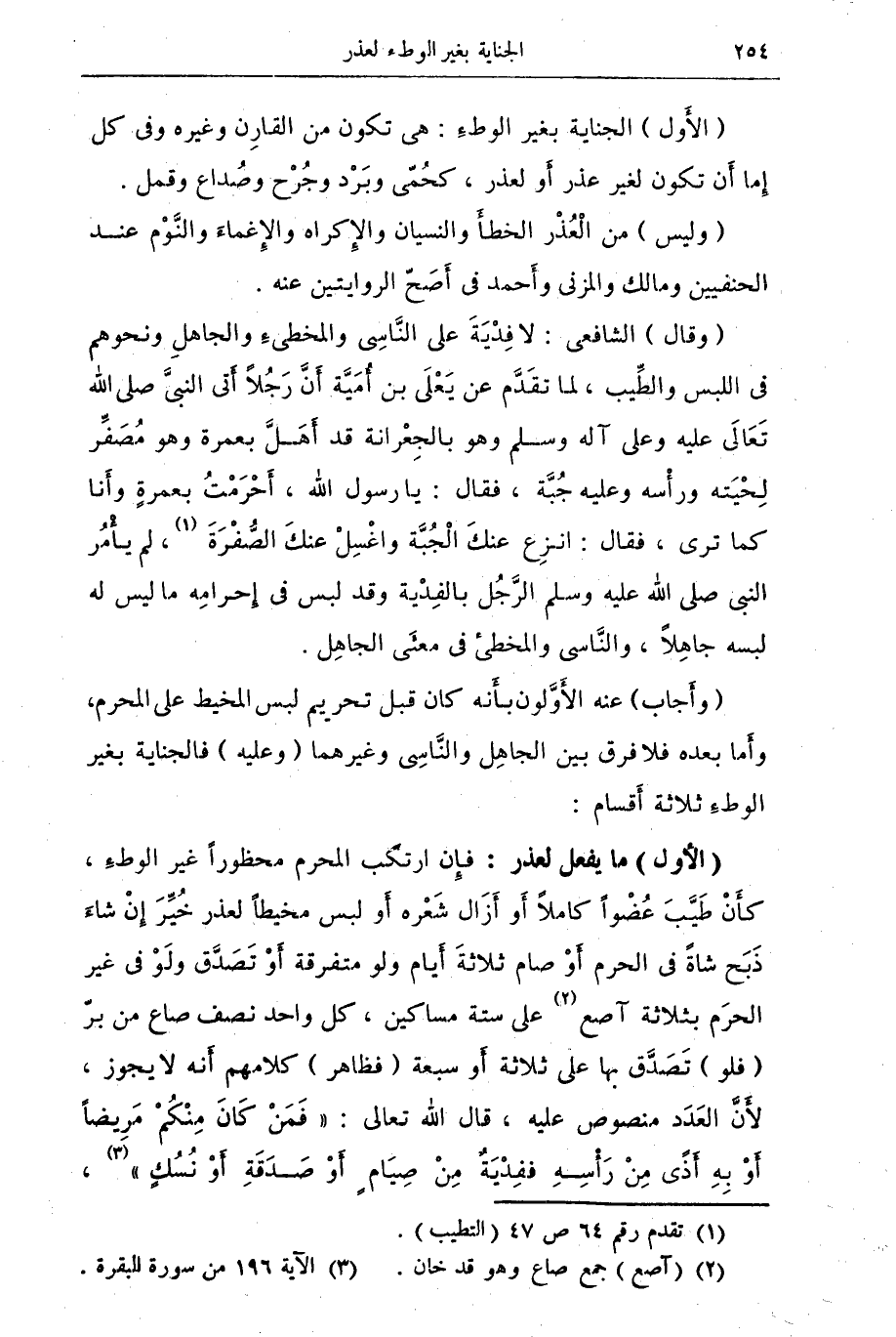 ... (وأجاب) عنه الأولون بأنه كان قبل تحريم لبس المخيط على المحرم، وأما بعده فلا فرق بين الجاهل والناسي وغيرهما (وعليه) فالجناية بغير الوطء ثلاثة أقسام: