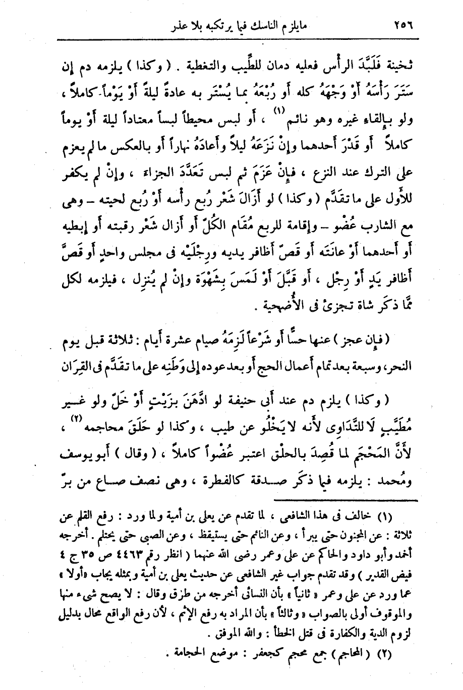 ... (وكذا) يلزم دم عند أبي حنيفة لو أدهن بزيت أو خل ولو غير مطيب لا للتداوي لأنه لا يخلو عن طيب، وكذا لو حلق محاجمه (¬2)، لأن المحجم لما قصد بالحلق اعتبر عضوا كاملا، (وقال) أبو يوسف ومحمد: يلزمه فيما ذكر صدقة كالفطرة، وهي نصف صاع من بر