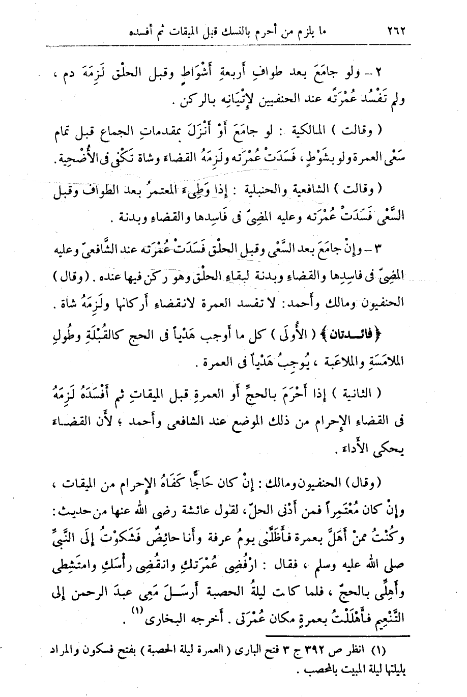 ... 3 - وإن جامع بعد السعي وقبل الحلق فسدت عمرته عند الشافعي وعليه المضي في فاسدها والقضاء وبدنة لبقاء الحلق وهو ركن فيها عنده. (وقال) الحنفيون ومالك وأحمد: لا تفسد العمرة لانقضاء أركانها ولزمه شاة.