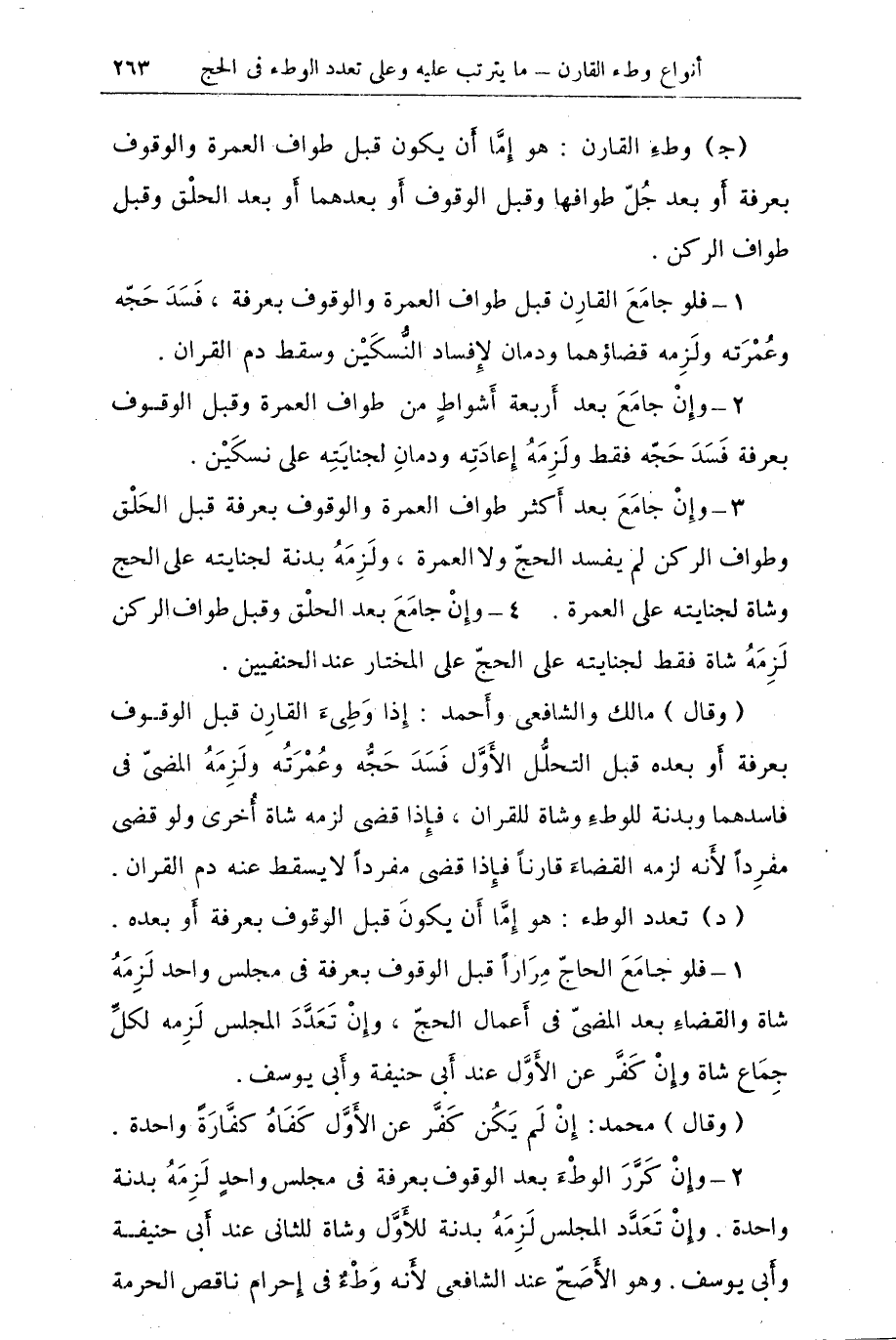 (جـ) وطء القارن: هو إما أن يكون قبل طواف العمرة والوقوف بعرفة أو بعد جل طوافها وقبل الوقوف أو بعدهما أو بعد الحلق وقبل طواف الركن.