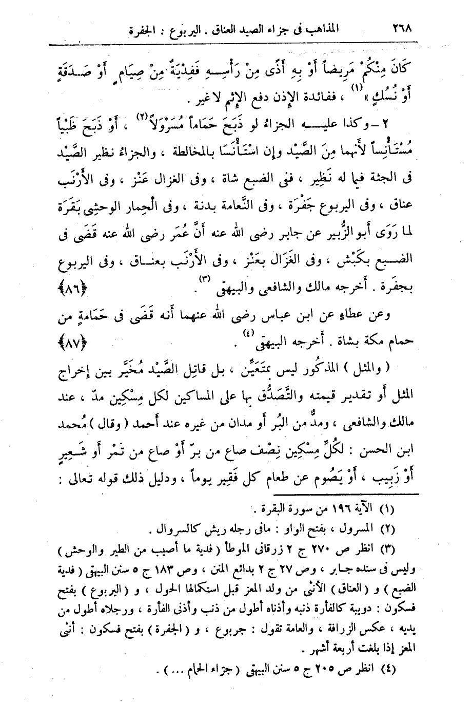 (¬3) أنظر ص 270 ج 2 زرقاني الموطأ (فدية ما أصيب من الطير والوحش) وليس في سنده جابر، وص 27 ج 2 بدائع المنن، وص 183 ج 5 سنن البيهقي (فدية الضبع) و (العناق) الأنثى من ولد المعز قبل استكمالها الحول، و (اليربوع) بفتح فسكون: دويبة كالفأرة ذنبه وأذناه أطول من ذنب وأذنى الفأرة، ورجلاه أطول من يديه، عكس الزرافة، والعامة تقول: جربوع، و (الجفرة) بفتح فسكون: أنثى المعز إذا بلغت أربعة أشهر.