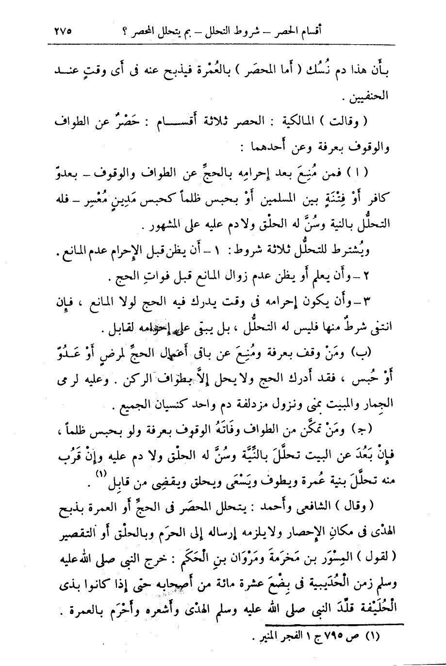 ... (وقالت) المالكية: الحصر ثلاثة أقسام: حصر عن الطواف والوقوف بعرفة وعن أحدهما:
