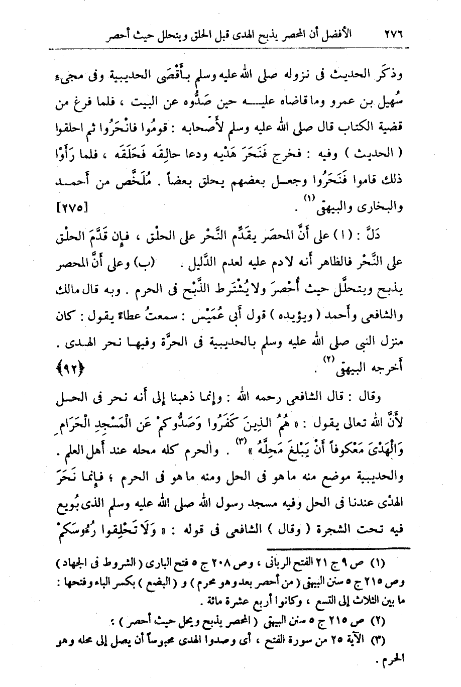 وذكر الحديث في نزوله صلى الله عليه وسلم بأقصى الحديبية وفي مجيء سهيل بن عمرو وما قاضاه عليه حين صدوه عن البيت، فلما فرغ من قضية الكتاب قال صلى الله عليه وسلم لأصحابه: قوموا فانحروا ثم احلقوا (الحديث) وفيه: فخرج فنحر هدية ودعا حالقه فحلقه، فلما رأوا ذلك قاموا فتحروا وجعل بعضهم يحلق بعضا. ملخص من أحمد والبخاري والبيهقي (¬1). {275}