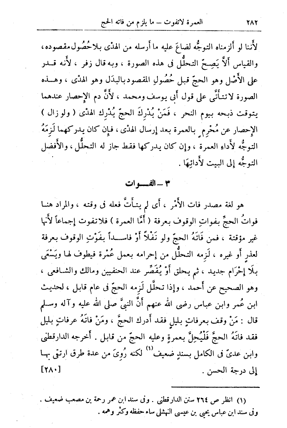 ... هو لغة مصدر فات الأمر، أي لم يتأت فعله في وقت، والمراد هنا فوات الحج بفوات الوقت بعرفة (أما العمرة) فلا تفوت إجماعا لأنها غير مؤقتة، فمن فاته الحج ولو نفلا أو فاسدا بفوت الوقوف بمعرفة لعذر أو غيره، لزمه التحلل إحرامه بعمل عمرة فيطوف لها ويسعى بلا إحرام جديد، ثم يحلق أو يقصر عند الحنفيين ومالك والشافعي، وهو الصحيح عن أحمد، وإذا تحلل لزمه الحج في عام قابل، لحديث ابن عمر وابن عباس رضي الله عنهم أن النبي صلى الله عليه وآله وسلم قال: من وقف بعرفات بليل فقد أدرك الحج، ومن فاته عرفات بليل فقد فاته الحج فليحل بعمرة وعليه الحج من قابل. أخرجه الدارقطني وابن عدى في الكامل بسند ضعيف (¬1) لكنه روى من عدة طرق ارتقى بها إلى درجة الحسن. {280}