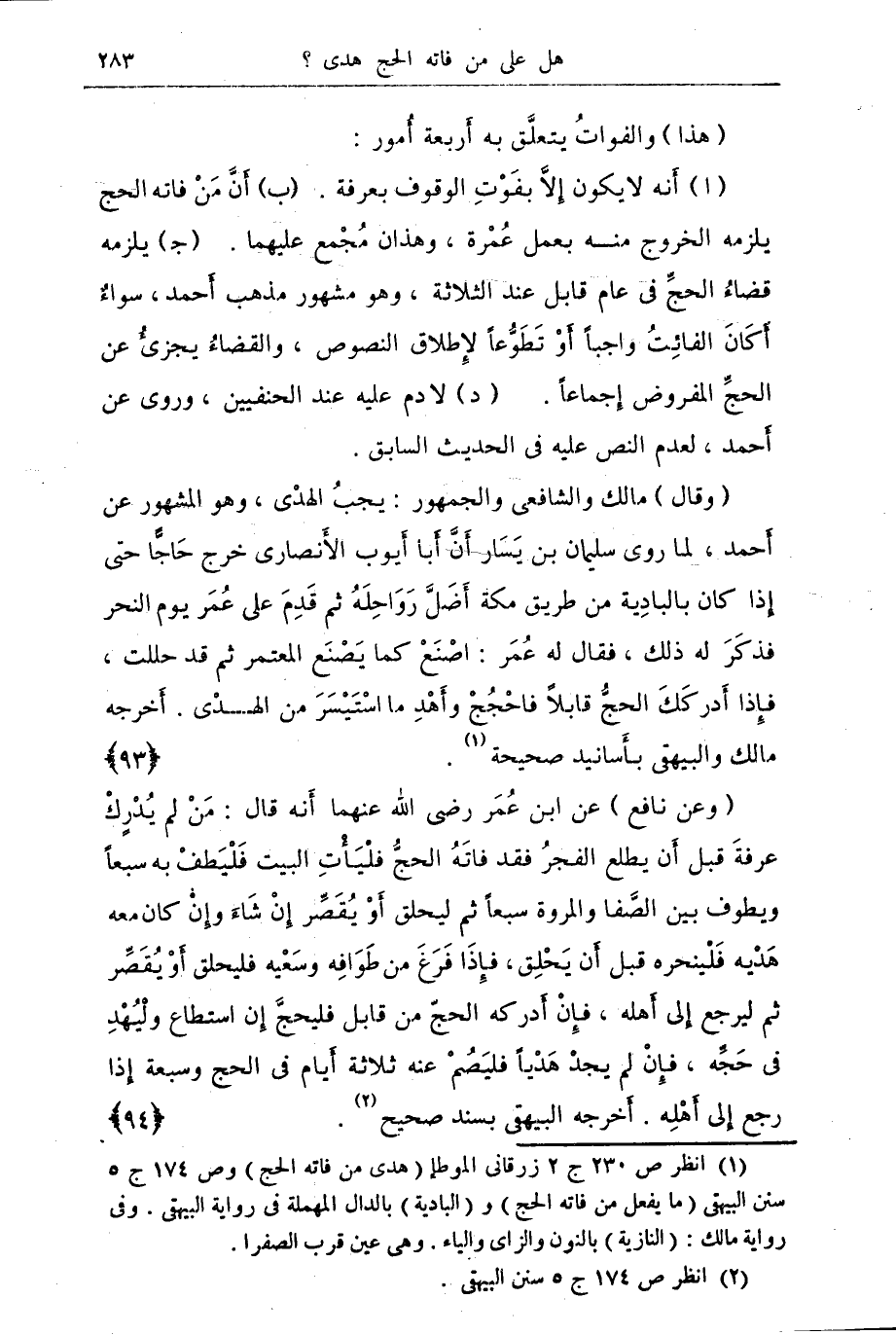 (¬1) أنظر ص 230 ج 2 زرقاني الموطأ (هدى من فاته الحج) وص 174 ج 5 سنن البيهقي (ما يفعل من فاته الحج) و (البادية) (بالدال المهملة في رواية البيهقي. وفي رواية مالك: النازية) بالنون والزاي والياء. وهي عين قرب الصفرا.