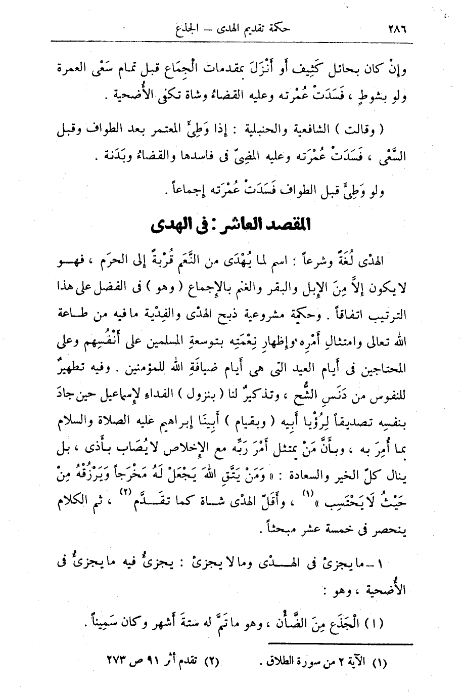 الهدى لغة وشرعا: أسم لما يهدي من النعم قربة إلى الحرم، فهو لا يكون إلا من الإبل والبقر والغنم بالإجماع (وهو) في الفضل على هذا الترتيب اتفاقا. وحكمية مشروعية ذبح الهدى والفدية ما فيه من طاعة الله تعالى وامتثال أمره وإظهار نعمته بتوسعة المسلمين على أنفسهم وعلى المحتاجين في أيام العيد التي هي أيام ضيافة الله للمؤمنين. وفيه تطهير للنفوس من دنس الشح، وتذكير لنا (بنزول) الفداء لإسماعيل حين جاد بنفسه تصديقا لرؤيا أبيه (وبقيام) أبينا إبراهيم عليه الصلاة والسلام بما أمر به، وبأن من يمتثل أمر ربه مع الإخلاص لا يصاب بأذى، بل ينال كل الخير والسعادة: "ومن يتق الله يجعل له مخرجا ويرزقه من حيث لا يحتسب" (¬1)، وأقل الهدى شاة كما تقدم (¬2)، ثم الكلام ينحصر في خمسة عشر مبحثا.