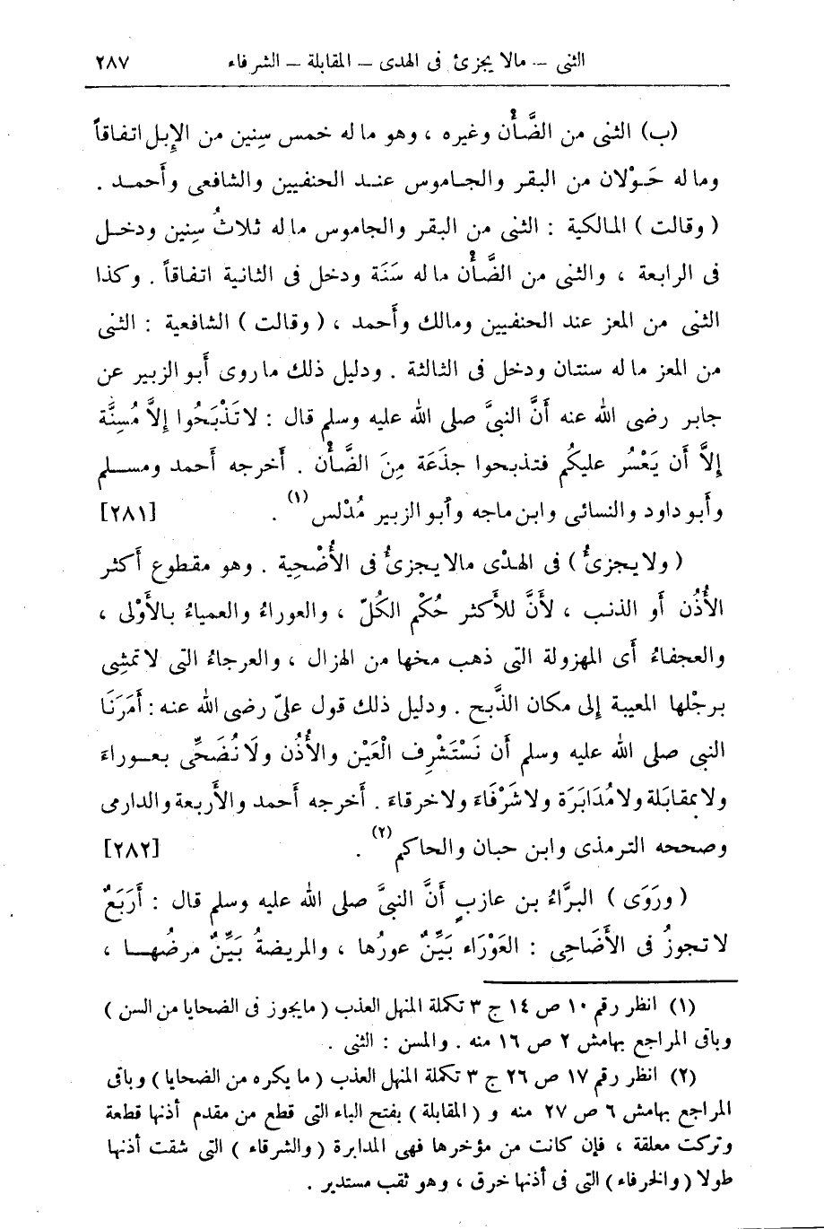 (¬1) أنظر رقم 10 ص 14 ج 3 تكملة المنهل العذب (ما يجوز في الضحايا من السن وباقي المراجع بهامش 2 ص 16 منه. والمسن: الثني.