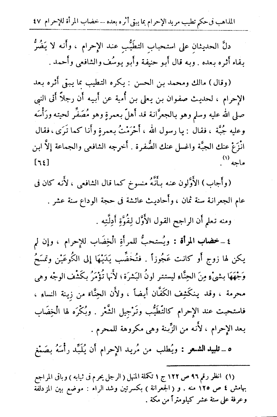 (¬1) انظر رقم 96 ص 122 ج 1 تكملة المنهل (الرجل يحرم فى ثيابه) وباقى المراجع بهامش 4 ص 125 منه. و (الجعرانة) بكسرتين وشد الراء: موضع بين المزدلفة وعرفة على ستة عشر كيلو متراً من مكة.