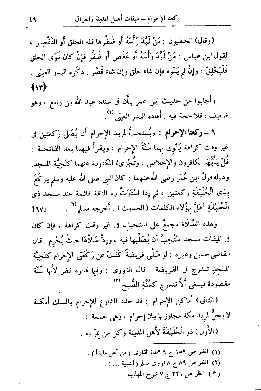 6 - ركعتا الإحرام: ويُستحبُّ لمريد الإحرام أَن يُصَلى رَكعتين فى غير وقت كراهة يَنْوِى بهما سُنَّةَ الإحرام، ويقرأْ فيهما بعد الفاتحة: قُلْ يَا أَيُّهَا الكافرون والإخلاص، وتُجْزئُ المكتوبة عنهما كتَحِيَّة المسجد. ودليله قولُ ابن عُمَر رضى الله عنهما: كان النبى صلى الله عليه وسلم يركَعُ بِذِى الْحُلَيْفَةِ ركعتين، ثم إذا اسْتَوَتْ به الناقة قائمة عند مسجد ذِى الْحُلَيْفَةِ أَهَلِّ بهؤُلاء الكلمات (الحديث). أخرجه مسلم (¬2) {67}