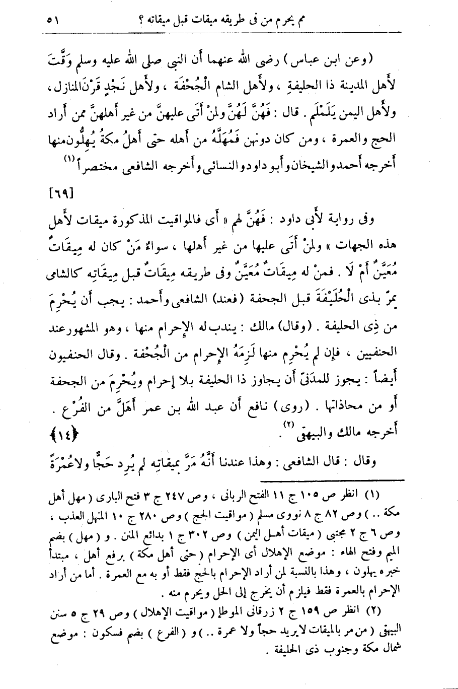 (¬2) انظر ص 159 ج 2 زرقانى الموطأ (مواقيت الإهلال) وص 29 ج 5 سنن البيهقى (من مر بالميقات لا يريد حجاً ولا عمرة .. ) و (الفرع) بضم فسكون: موضع شمال مكة وجنوب ذى الحليفة.