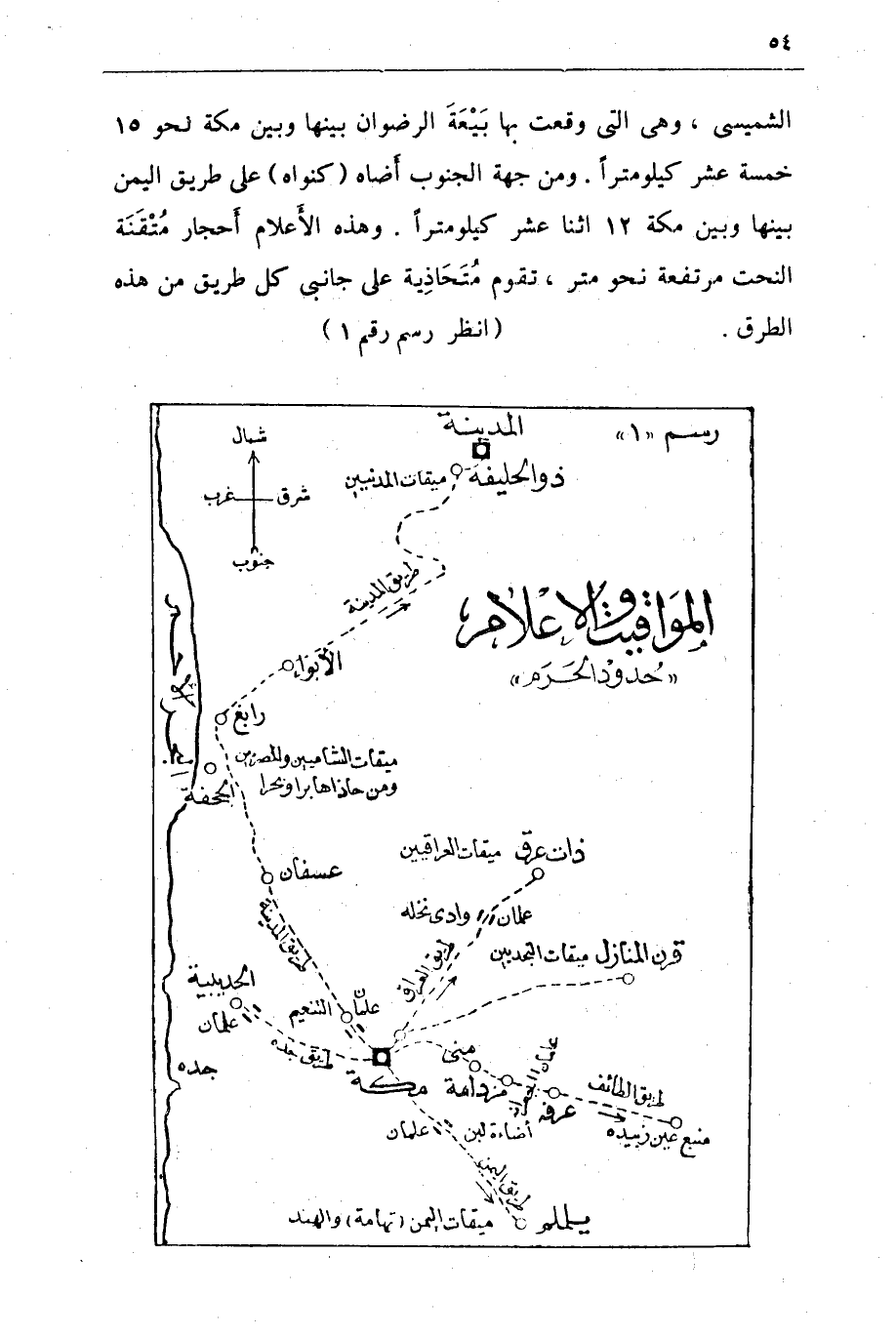 الشميسى، وهي التى وقعت بها بَيْعَةَ الرضوان بينها وبين مكة نحو 15 خمسة عشر كيلو متراً. ومن جهة الجنوب أَضاه (كنواه) على طريق اليمين بينها وبين مكة 12 اثنا عشر كيلو متراً وهذه الأعلام أحجار مُتْقَنَة النحت مرتفعة نحو متر، تقوم مُتَحَاذِية على جانبى كل طريق من هذه الطرق (انظر رسم رقم 1).