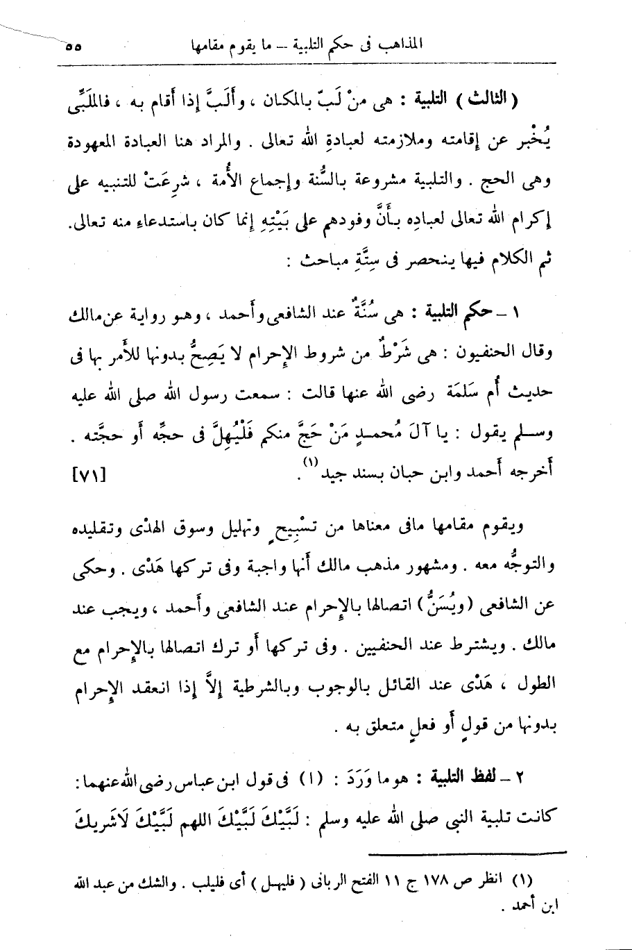 1 - حكم التلبية: هى سُنَّةٌ عند الشافعى وأحمد، وهو رواية عن مالك وقال الحنفيون: هى شَرْطٌ من شروط الإحرام لا يَصحُّ بدونها للأمر بها فى حديث أُم سَلمَة رضى الله عنها قالت: سمعت رسول الله صلى الله عليه وسلم يقول: يا آلَ مُحمدٍ مَنْ حَجَّ منكم فَلْيُهِلَّ فى حجِّه أَو حجَّته. أخرجه أحمد وابن حبان بسند جيد (¬1) {71}
