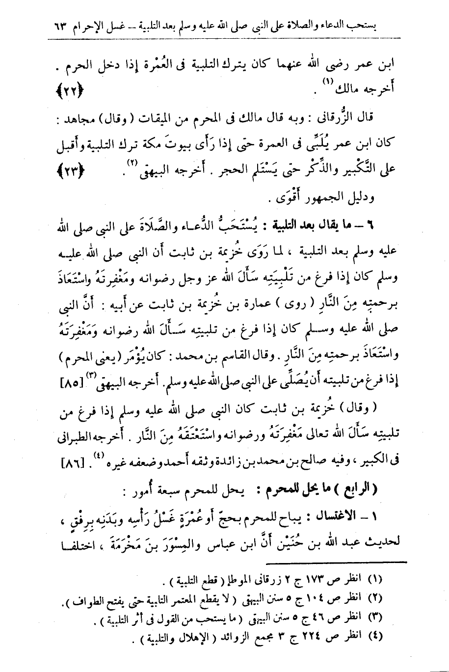 6 - ما يقال بعد التلبية: يُسْتَحَبُّ الدُّعاء والصَّلاَة على النبي صلى الله عليه وسلم بعد التلبية , لما رَى خُزيمة بن ثابت أن النبي صلى الله عليه وسلم كان إِذا فرغ من تَلْبِيتِه سَأَلَ الله عز وجل رضوانه ومَغْفِرتَهُ واسْتَعَاذَ برحمتِه مِنَ النَّارِ (روى) عمارة بن خُزيمة بن ثابت عن أَبيه: أَن النبي صلى الله عليه وسلم كان إذا فرغ من تلبيتِه سَأَلَ الله رضوانه وَمَغْفِرَتَهُ واستَعَاذَ برحمتِه مِنَ النَّار. وقال القاسم بن محمد: كان يُؤْمَر (يعنى المحرم) إذا فرغ من تلبيته أَن يُصَلِّى على النبي صلى الله عليه وسلم. أخرجه البيهقى (¬3) {85}