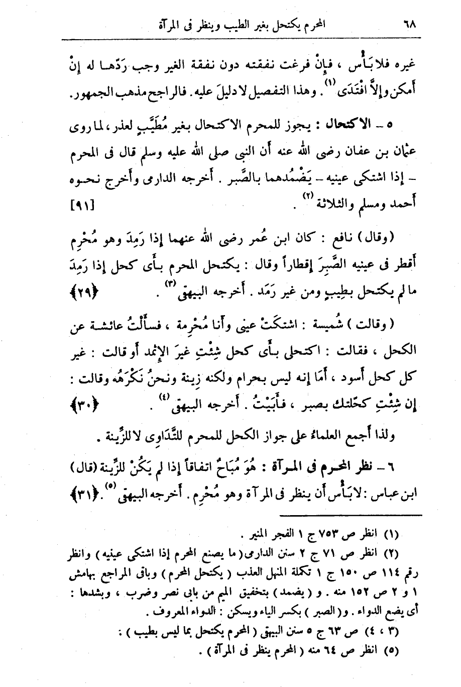 5 - الاكتحال: يجوز للمحرم الاكتحال بغير مُطَيَّبٍ لعذر، لما روى عثمان بن عفان رضى الله عنه أن النبي صلى الله عليه وسلم قال في المحرم - إذا اشتكى عينيه - يَضْمُدهما بالصَّبر. أخرجه الدارمى وأخرج نحوه احمد ومسلم والثلاثة (¬2) {91}