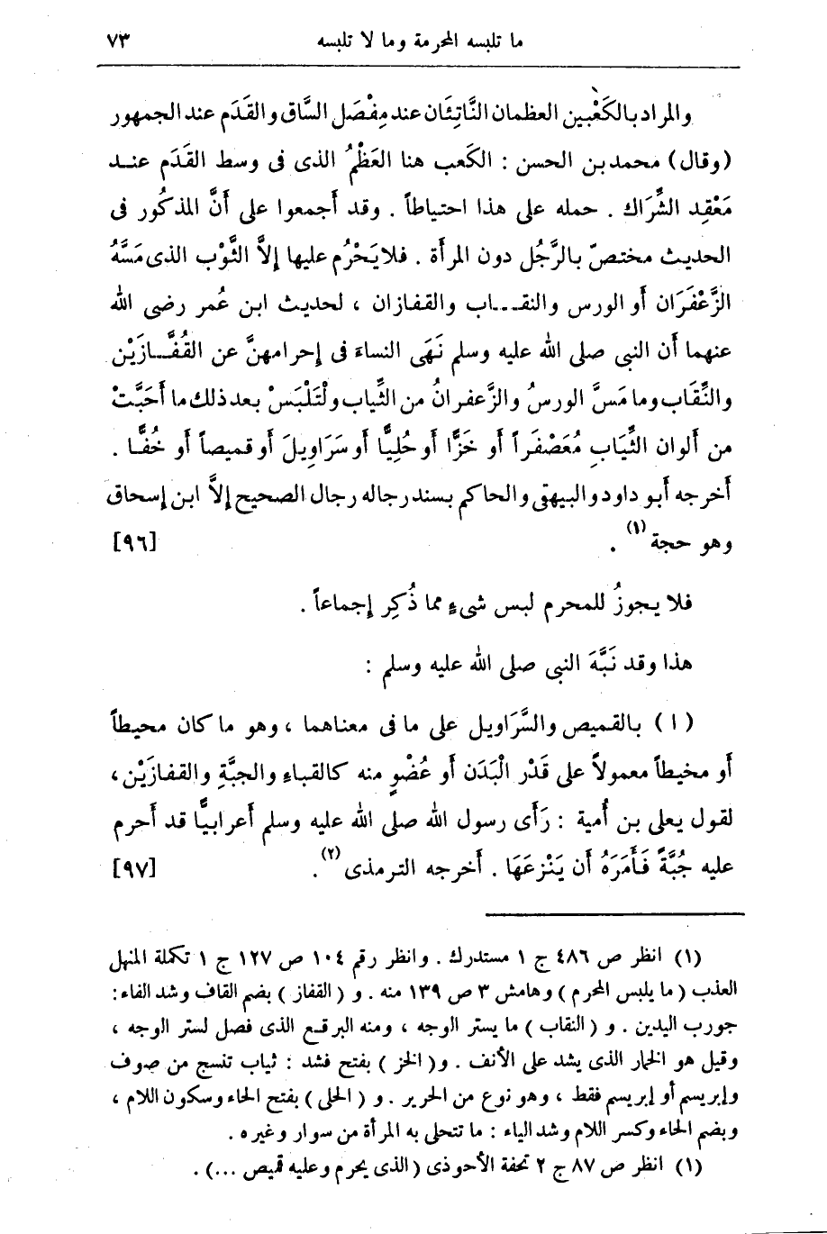 والمراد بالكعبين العظمان الناتئان عند مفصل السَّاق والقدم عند الجمهور (وقال) محمد بن الحسن: الكعب هنا العظم الذي في وسط القدم عند مقعد الشراك. حمله على هذا احتياطاً. وقد اجمعوا على أن المذكور في الحديث مختص بالرَّجُل دون المرأة. فلا يحرم عليها إلا الثوب الذي مسه الزعفران أو الورس والنقاب والقفازان , لحديث ابن عمر رضي عنهما أن النبي صلى الله عليه وسلم نهى النساء في إحرامهن عن القفَّازين والنقاب وما مس الورس والزعفران من الثياب ولتلبس بعد ذلك ما أحبطت من ألوان الثياب معصفراً أو خز أو حلياً أو سراويل أو قمصا أو خفا. أخرجه أبو داود والبيهقى والحاكم بسند رجاله رجال الصحيح إلا ابن إسحق وهو حجة (¬1) {96}