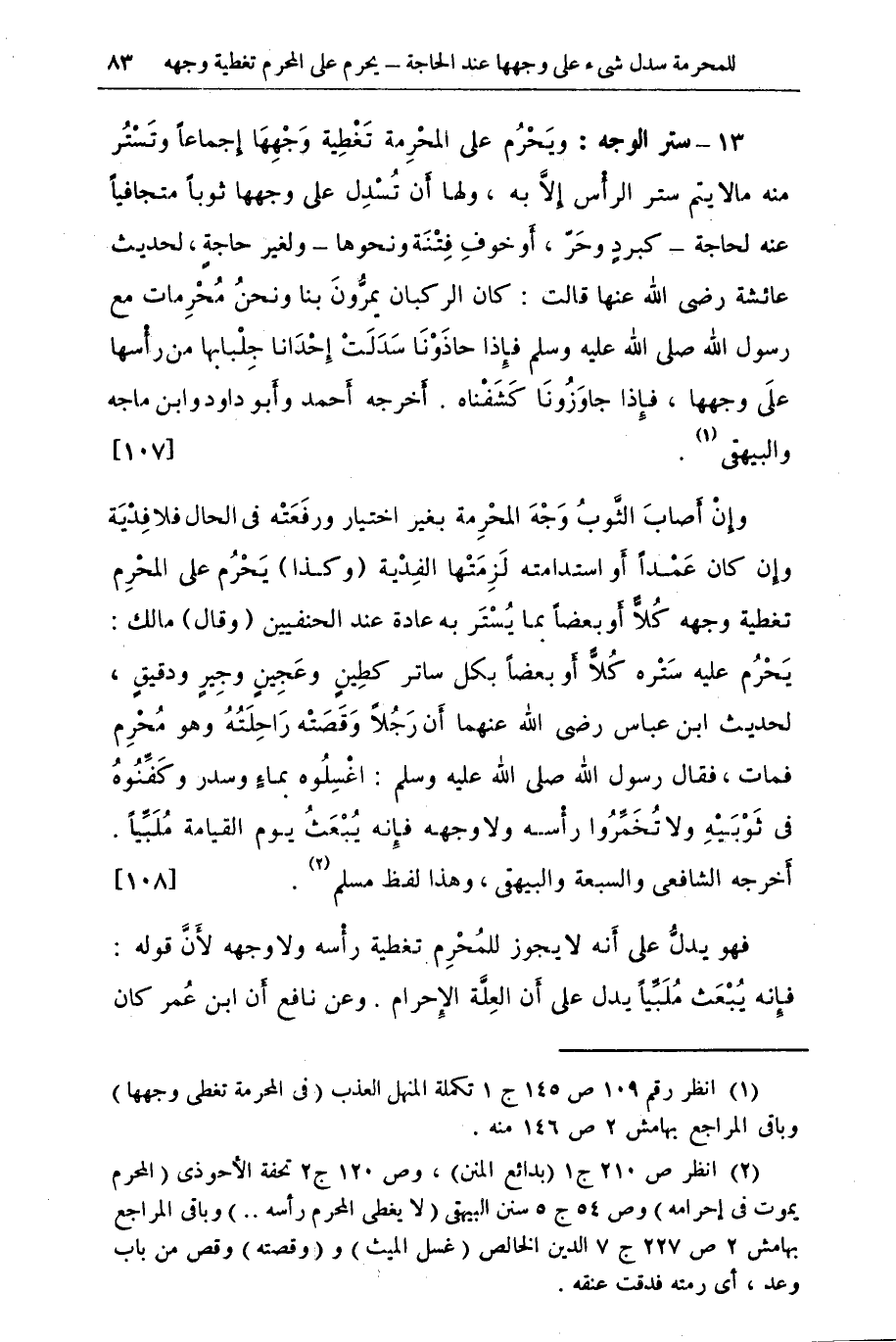 (¬1) انظر رقم 109 ص 145 ج 1 تكملة المنهل العذب (في المحرمة تغطي وجهها) وباقي المراجع بهامش 2 ص 146 منه.