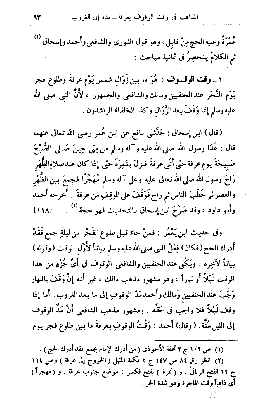 (قال) ابن إسحاق: حدثنى نافع عن ابن عمر رضى الله تعالى عنهما قال: غدا رسول الله صلى الله تعالى وآله وسلم من منى حين صلى الصبح صبيحة يوم عرفة حتى أتى عرفة فنزل بنمرة حتى إذا كان عند صلاة الظهر راح رسول الله صلى الله تعالى عليه وعلى آله وسلم مهجرا فجمع بين الظهر والعصر ثم راح فوقف على الوقوف من عرفة. أخرجه أحمد وأبو داود , وقد صرح ابن إسحاق بالتحديث فهو حجة (¬2) {118}