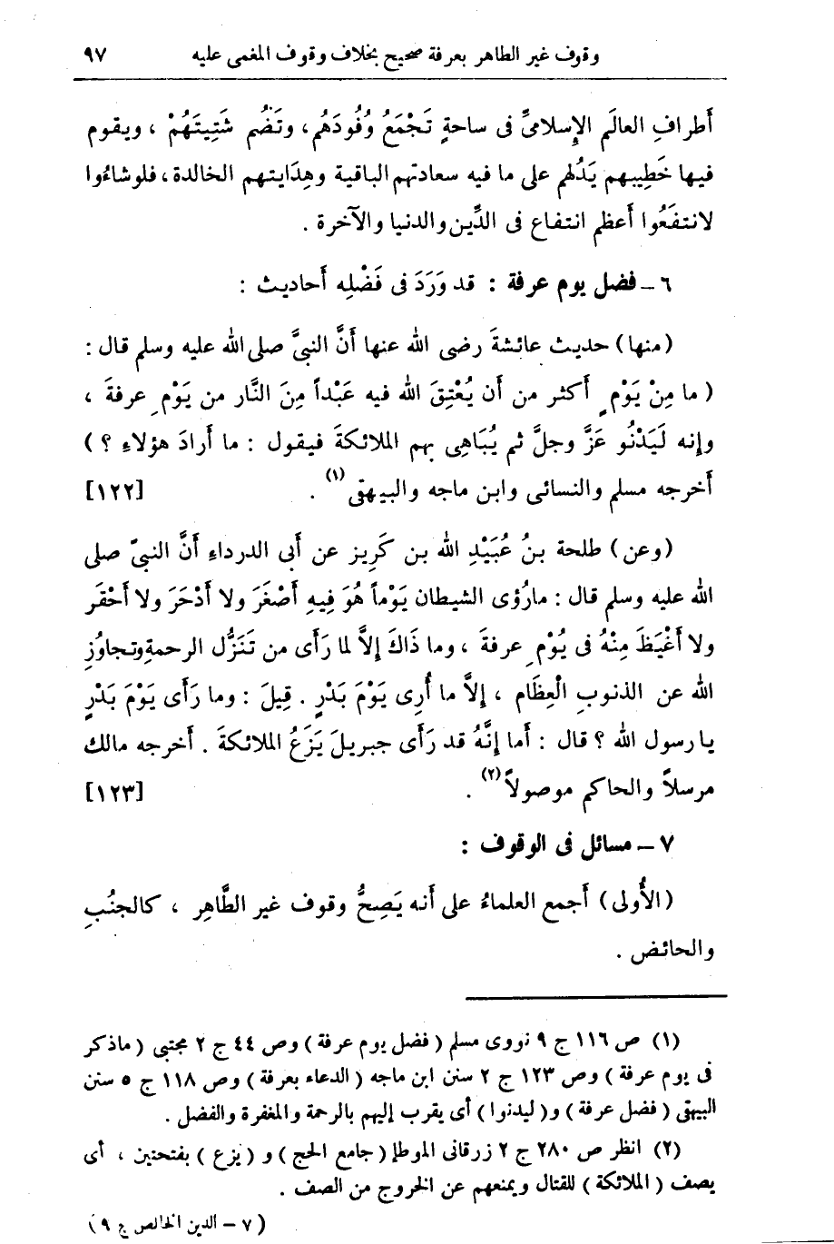 (7) مسائل في الوقوف - (الأولى) أجمع العلماء على أنه يصح وقوف غير الطاهر , كالجنب والحائض.