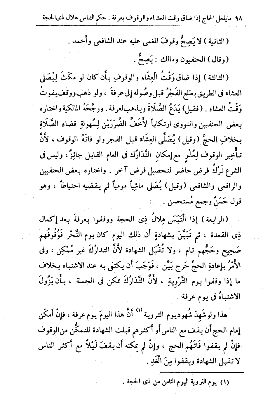 (الثالثة) إذا ضاق وقت العشاء والوقوف بأن كان لو مكث ليصلى العشاء في الطريق يطلع الفجر قبل وصوله إلى عرفة ولو ذهب ووقف يفوت وقت العشاء. (فقيل) يدع الصلاة ويذهب لعرفة. ورجحه المالكية واختاره بعض الحنفيين والنووي ارتكاباً لأخف الضررين لسهولة قضاء الصلاة بخلاف الحج (وقيل) يصلى العشاء قبل الفجر ولو فاته الوقوف , لأن تأخير الوقوف لعذر مع إمكان التدارك في العام القابل جائز وليس في الشرع ترك فرض حاضر لتحصيل فرض آخر. واختاره بعض الحنفيين والرافعي والشافعي (وقيل) يصلى ماشياً موميا ثم يقضبه احتياطياً وهو قول حسن وجمع مستحسن.