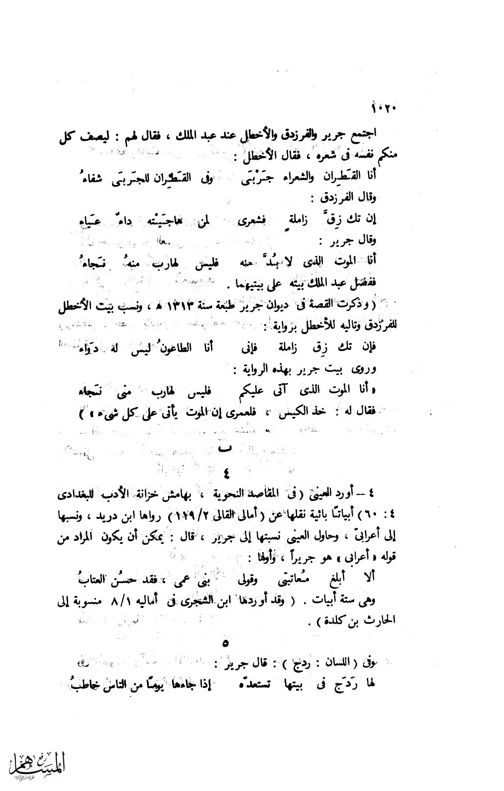 (وذكرت القصة في ديوان جرير طبعة سنة 1313 هـ، ونسب بيت الاخطل للفرزدق وتاليه للأخطل برواية: