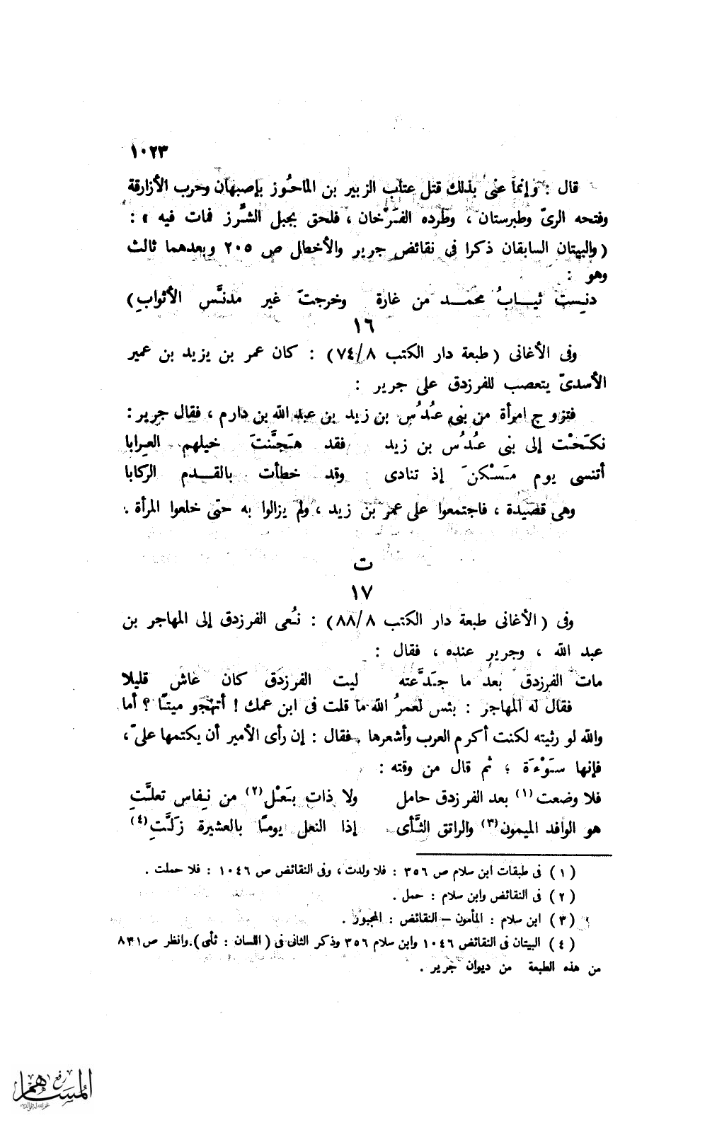 وفى (الأغانى طبعة دار الكتب 8/ 88): نعى الفرزدق إلى المهاجر بن عبد الله، وجرير عنده، فقال: