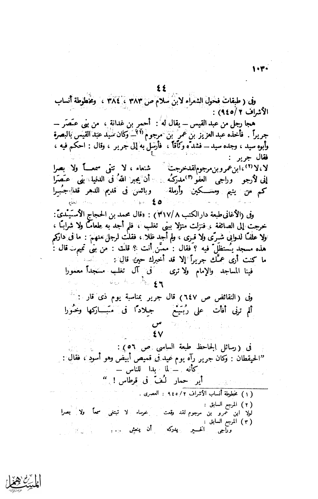 وفى (الأغانى طبعة دار الكتب 8/ 317): "قال محمد بن الحجاج الأسيدىّ: خرجت إلى الصائفة، فنزلت منزلا ببنى تغلب، فلم أجد به طعامًا ولا شرابًا، ولا علفَا لدوابى شرّى ولا قرى، ولم اجد ظلا، فقلت لرجل منهم: ما فى داركم هذه مسجد يستظل فيه؟ فقال: ممَّن أنت؟ قلت: من بنى تميم قال: ما كنت أرى عمَّك جريرًا إلا قد أخبرك حين قال: