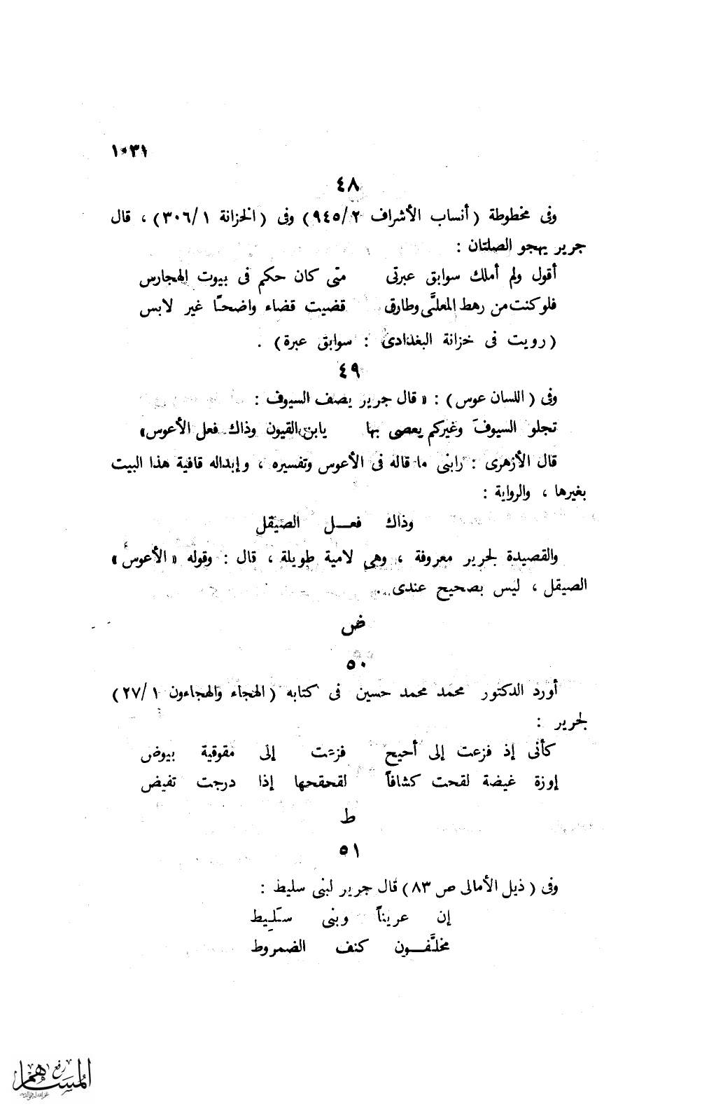 أورد الدكتور محمد محمد حسين فى كتابه (الهجاء والهجاءون 1/ 27) لجرير: