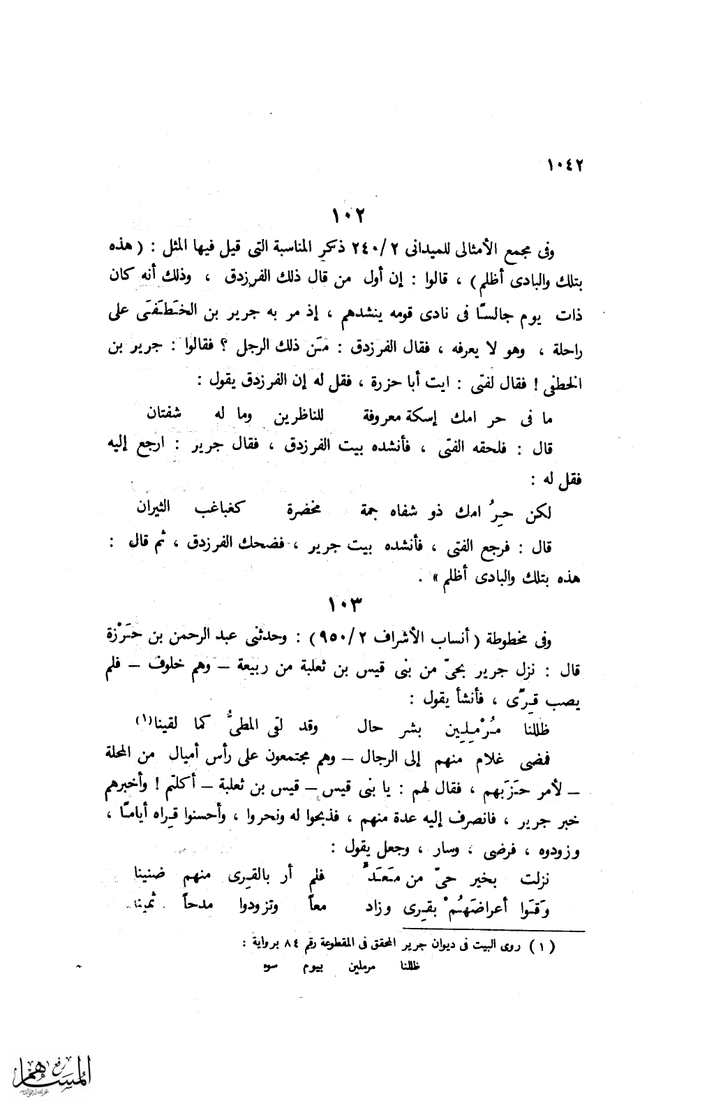 قال: فرجع الفتى، فأنشده بيت جرير، فضحك الفرزدق، ثم قال: هذه بتلك والبادى أظلم".