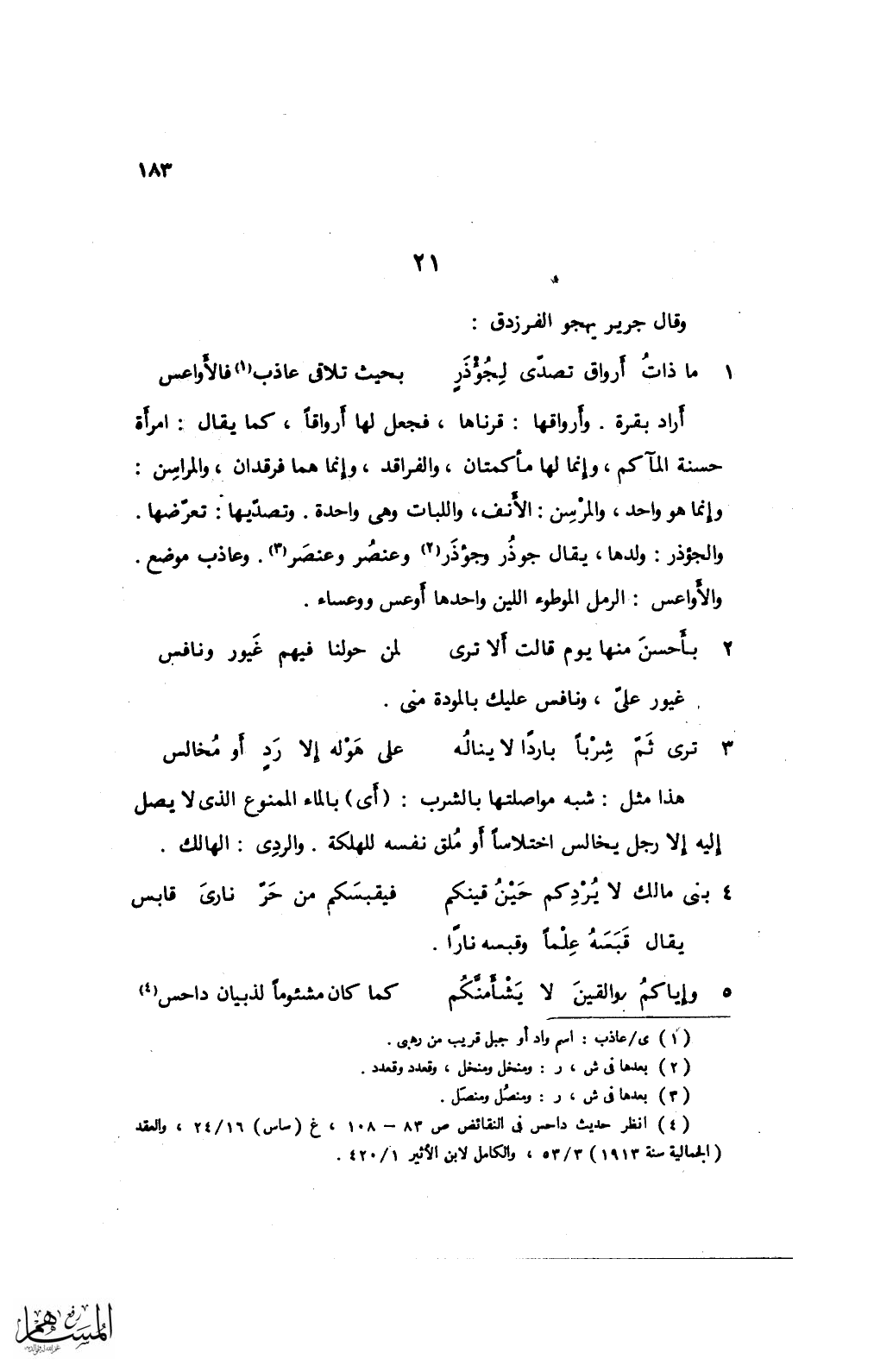 أراد بقرة. وأرواقها: قرناها، فجعل لها أوراقًا، كما يقال: امرأة حسنة المآكم، وإنما لها مأكمتان، والفراقد، وإنما هما فرقدان، والمراسن: وإنما هو واحد. والمرسن: الأنف، واللبات وهي واحدة. وتصدّيها: تعرّضها. والجؤذر: ولدها، يقال جوذر وجؤذر وعنصُر وعنصَر. وعاذب موضع. والأواعس: الرمل الموطوء اللين واحدها أوعس ووعساء.