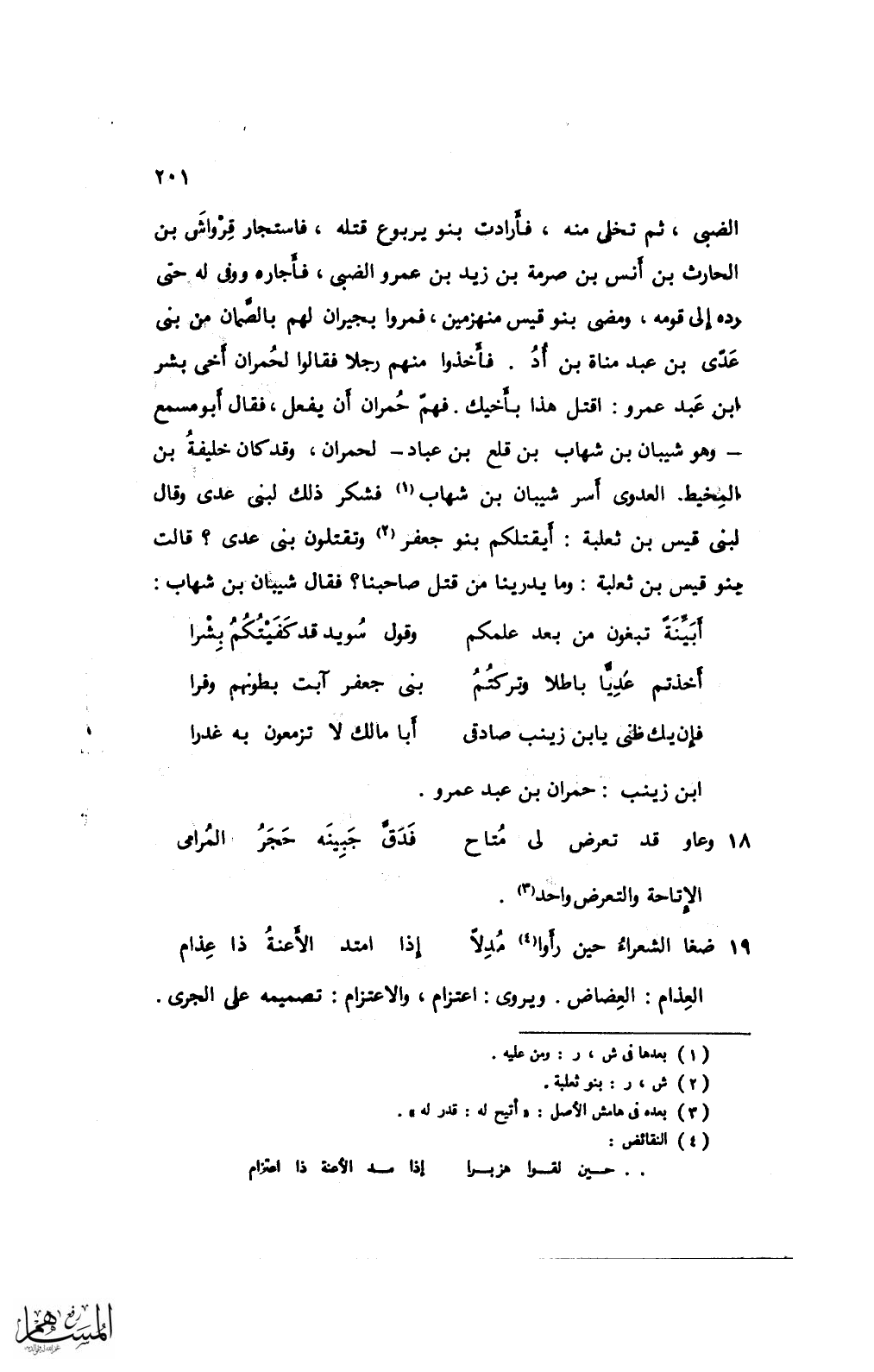 الضبي، ثم تخلى منه، فأرادت بنو يربوع قتله، فاستجار قرواش بن الحارث بن أنس بن صرمة بن زيد بن عمرو الضبي، فأجاره ووفى له حتى رده إلى قومه، ومضى بنو قيس منهزمين، فمروا بجيران لهم بالصَّمان من بني عدَّي بن عبد مناة بن أد. فأخذوا منهم رجلًا فقالوا لحمران أخي بشر ابن عبد عمرو: اقتل هذا بأخيك. فهمّ حمران أن يفعل، فقال أبو مسمع - وهو شيبان بن شهاب بن قلع بن عباد - لحمران، وقد كان خليفة بن المخيط. العدوى أسر شيبان بن شهاب فشكر ذلك لبني عدي وقال لبني قيس بن ثعلبة: أيقتلكم بنو جعفر وتقتلون بني عدي؟ قالت بنو قيس بن ثعلبة: وما يدرينا من قتل صاحبنا؟ فقال شيبان بن شهاب: