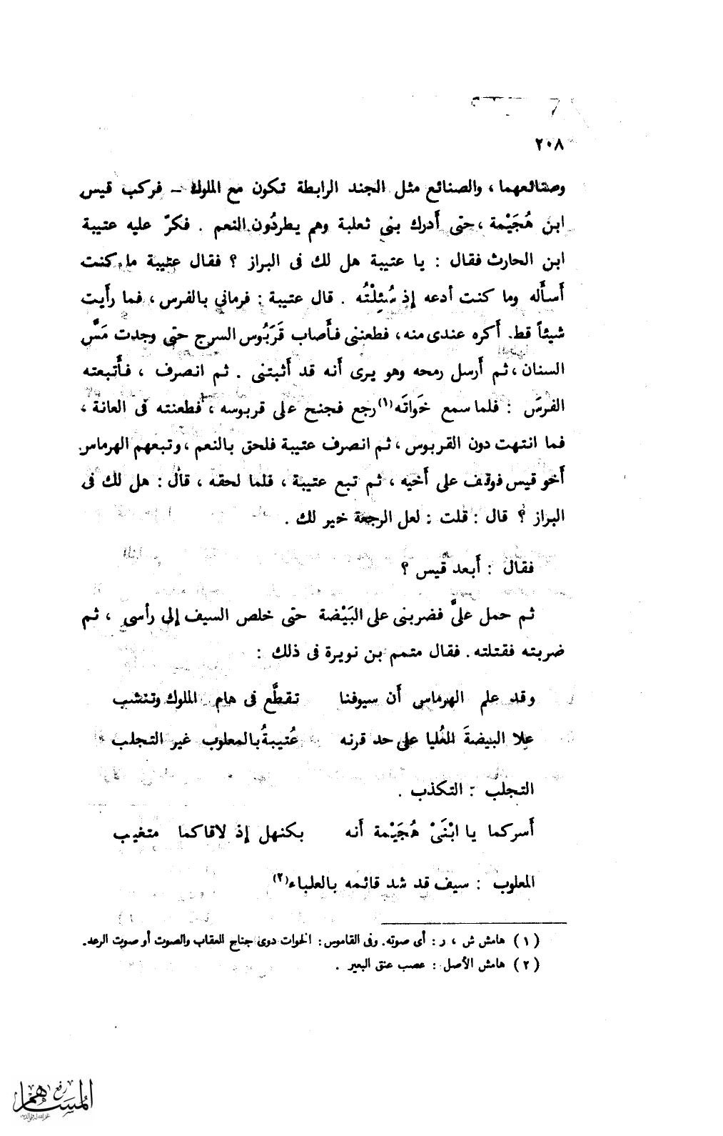 وصنائعهما، والصنائع مثل الجند الرابطة تكون مع الملوك - فركب قيس ابن هجيمة، حتى أدرك بني ثعلبة وهم يطردون النعم. فكرّ عليه عتيبة ابن الحارث فقال: يا عتيبة هل لك في البراز؟ فقال عتيبة ما كنت أسأله وما كنت أدعه إذ سئلته. قال قتيلة: فرماني بالفرس، فما رأيت شيئًا قط أكره عندي منه، فطعنني فأصاب قربوس السرج حتى وجدت مسَّ السنان، ثم أرسل رمحه وهو يرى أنه قد أثبتني. ثم انصرف، فأتبعته الفرس: فلما سمع خواته رجع فجنح على قربوسه، فطعنته في العانة، فما انتهت دون القربوس، ثم انصرف عتيبة فلحق بالنعم، وتبعهم الهرماس أخو قيس فوقف على أخيه، ثم تبع عتيبة، فلما لحقه، قال: هل لك في البراز؟ قال: قلت: لعل الرجعة خير لك.