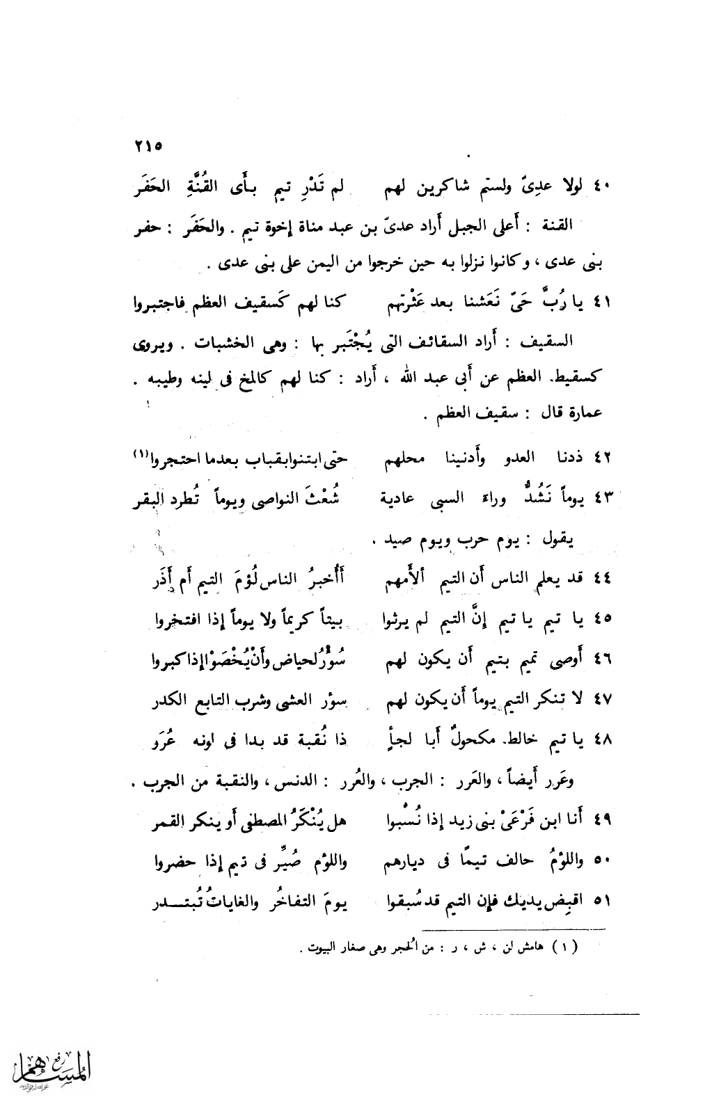 40 لولا عديّ ولستم شاكرين لهم ... لم تدر تيم بأي القنَّة الحفر