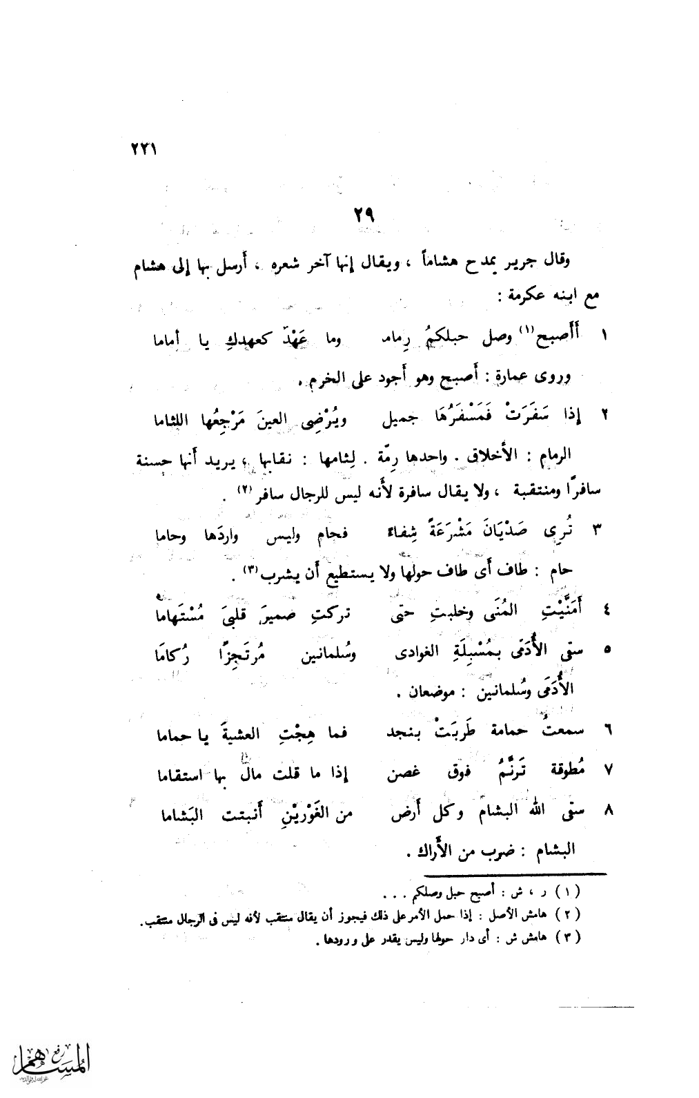 وقال جرير يمدح هشامًا، ويقال إنها آخر شعره، أرسل بها إلى هشام مع ابنه عكرمة: