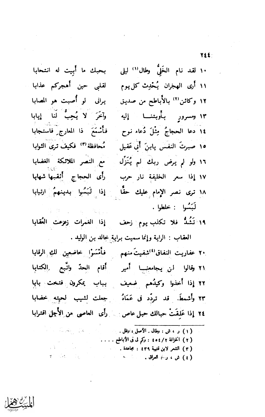 19 تشد فلا تكذب يوم زحف ... إذا الغمرات زعزعت العقابا
