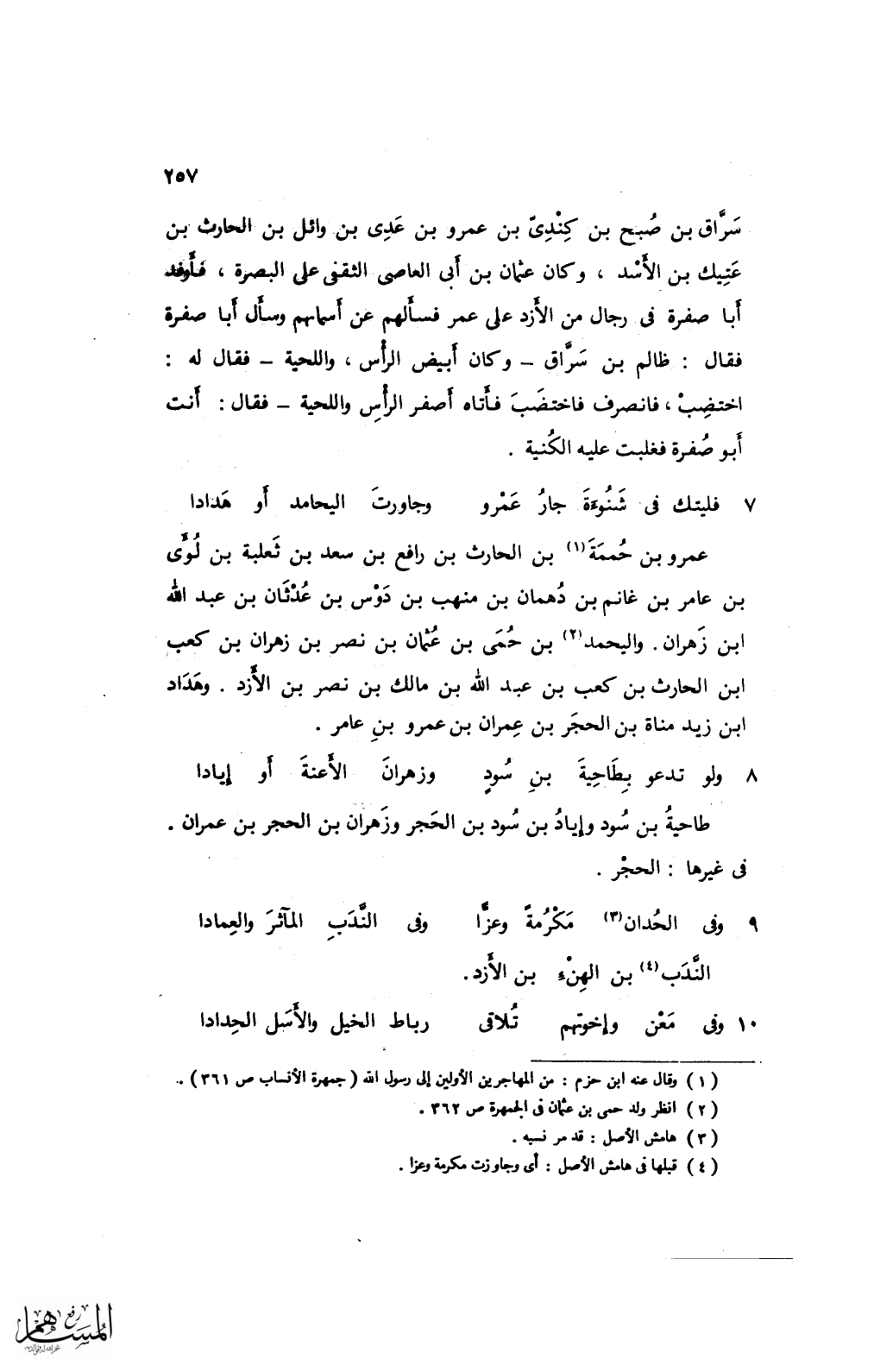 عمرو بن حممة بن الحارث بن رافع بن سعد بن ثعلبة بن لؤي بن عامر بن غانم بن دهمان بن منهب بن دوس بن عدثان بن عبد الله ابن زهران. واليحمد بن حمى بن عثمان بن نصر بن زهران بن كعب ابن الحارث بن كعب بن عبد الله بن مالك بن نصر بن الأزد. وهداد ابن زيد مناة بن الحجر بن عمران بن عمرو بن عامر.
