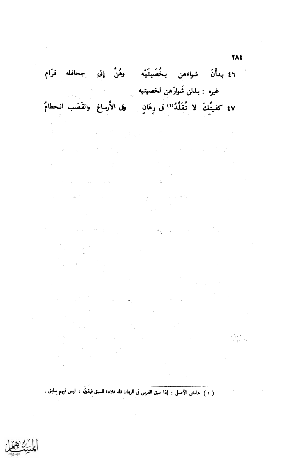 47 كفيتك لا تقلَّد في رهان ... وفي الأرساغ والقصب انحطام