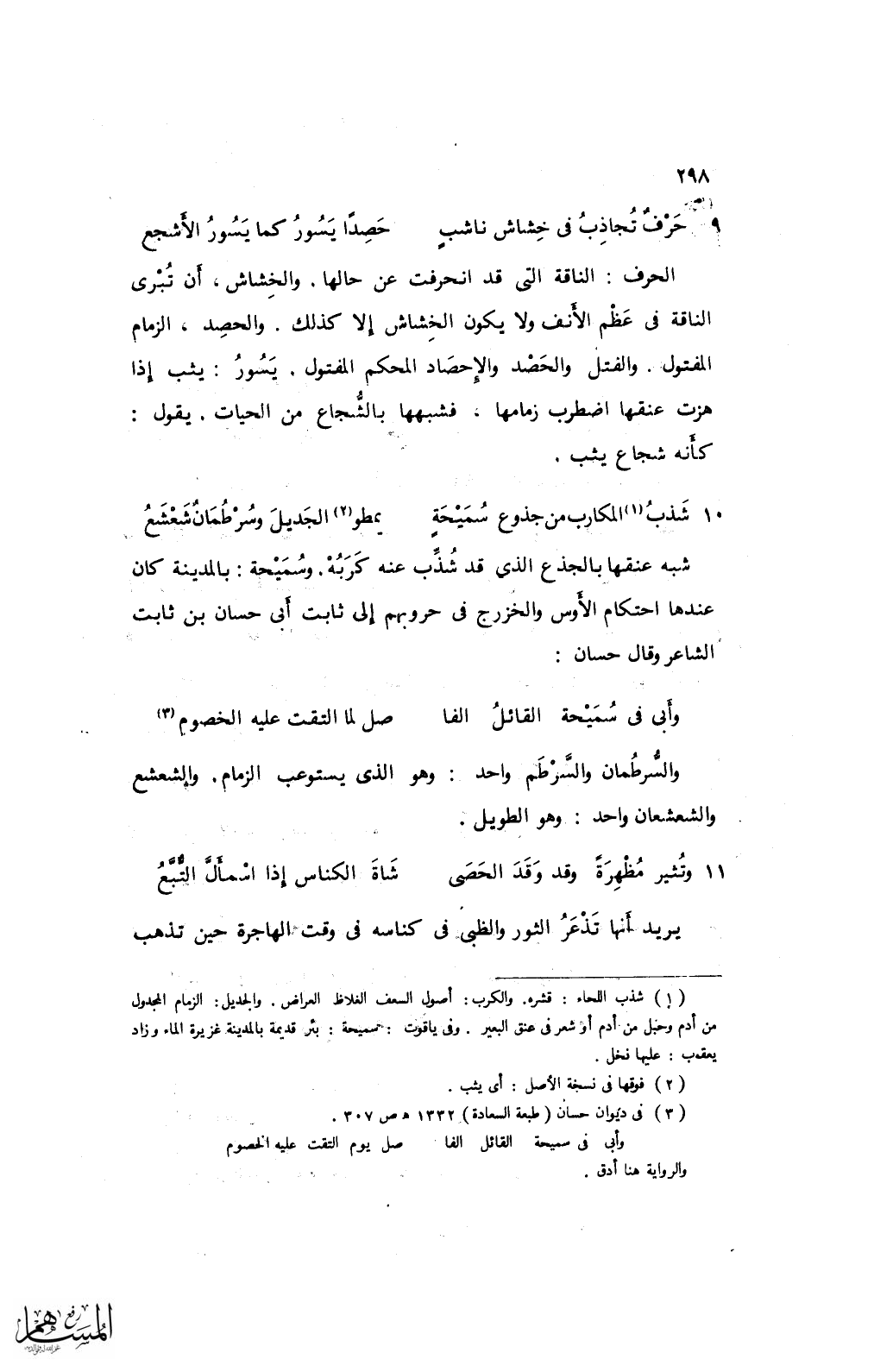 الحرف: الناقة التي قد انحرفت عن حالها. والخشاش، أن تبري الناقة في عظم الأنف ولا يكون الخشاش إلا كذلك. والحصد، الزمام المفتول. والفتل والحصد والإحصاد المحكم المفتول. يسور: يثب إذا هزت عنقها اضطرب زمامها، فشبهها بالشُّجاع من الحيات. يقول: كأنه شجاع يثب.