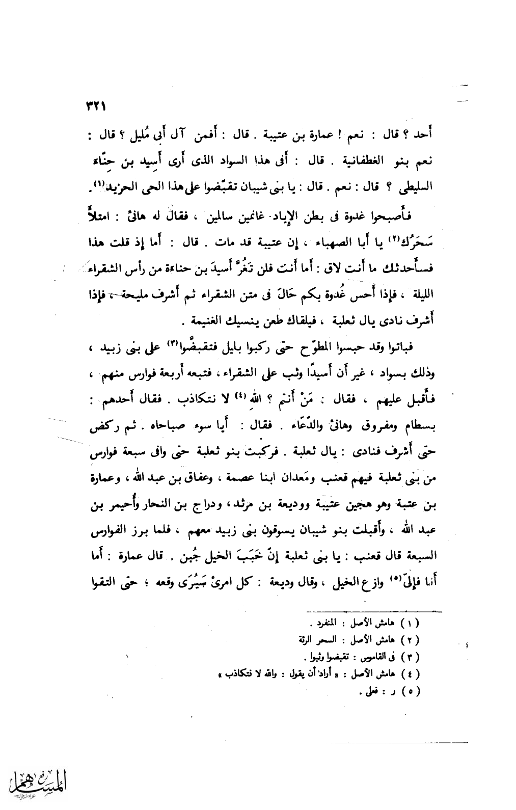 أحد؟ قال: نعم! عمارة بن عتيبة. قال: أفمن آل أبي مليل؟ قال: نعم بنو الغطفانية. قال: أفي هذا السواد الذي أرى أسيد بن حنّاء السليطي؟ قال: نعم. قال: يا بني شيبان تقبّضوا على هذا الحي الحزيد.