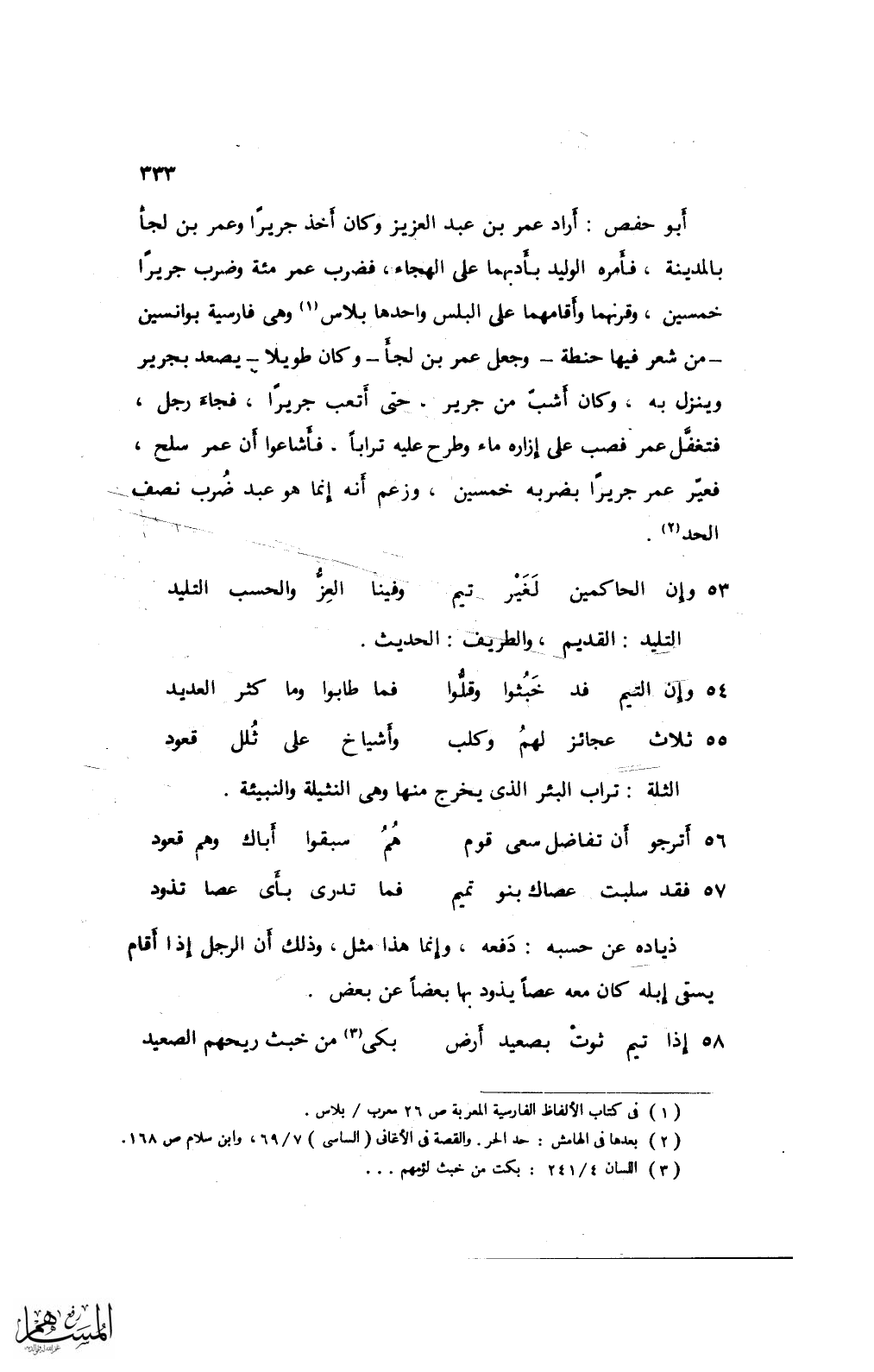 أبو حفص: أراد عمر بن عبد العزيز وكان أخذ جريرًا وعمر بن لجأ بالمدينة، فأمره الوليد بأدبهما على الهجاء، فضرب عمر مئة وضرب جريرًا خمسين، وقرنهما وأقامهما على البلس واحدها بلاس وهي فارسية بوانسين - من شعر فيها حنطة - وجعل عمر بن لجأ - وكان طويلًا - يصعد بجرير وينزل به، وكان أشبّ من جرير، حتى أتعب جريرًا، فجاء رجل، فتغفَّل عمر فصب على إزارة ماء وطرح عليه ترابًا. فأشاعوا أن عمر سلح، فعيّر عمر جريرًا بضربه خمسين، وزعم أنه إنما هو عبد ضرب نصف الحد.