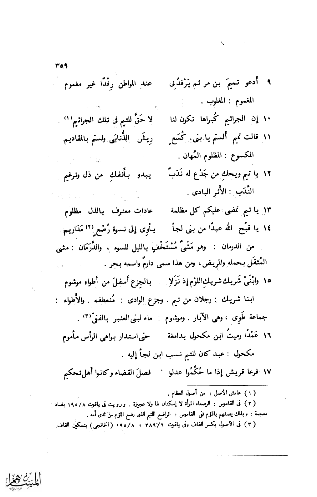9 أدعو تميم بن مر ثم يرفدني ... عند المواطن رفدًا غير مغموم