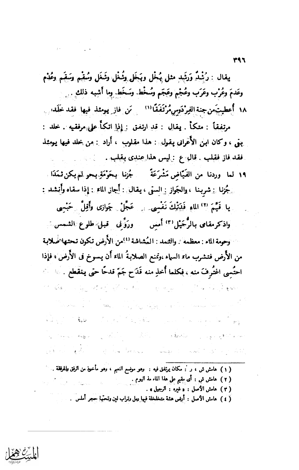 مرتفقًا: متكأ. يقال: قد ارتفق: إذا اتكأ على مرفقيه. خلد: بقي، وكان ابن الأعرابي يقول: هذا مقلوب، أراد: من خلد فيها يومئذ فقد فاز فقلب. قال ع: ليس هذا عندي بقلب.