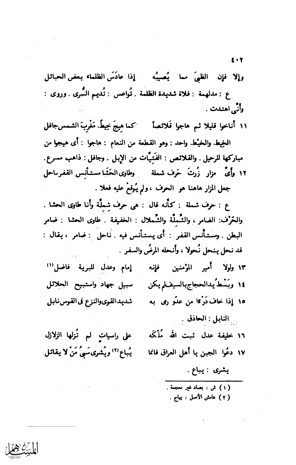 ع: جمع شملة: كأنه قال: هي حرف شملَّة وأنا طاوي الحشا. والخرف: الضامر، والشِّملَّلة والشِّملال: الخفيفة. طاوى الحشا: ضامر البطن. ومستأنس القفر: أي يستأنس فيه. ناحل: ضامر، يقال: قد نحل ينحل نحولًا، وأنحله المرض والسفر.