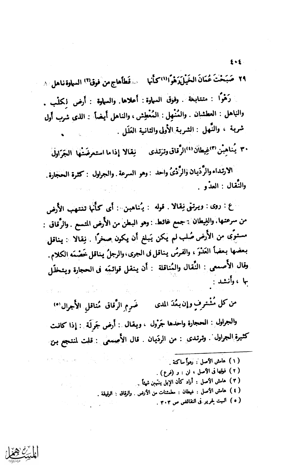 رهوًا: متتابعة. وفوق السماوة: أعلاها. والسماوة: أرض لكلب. والناهل: العطشان. والمنهل: المعطش، والناهل أيضًا: الذي شرب أول شربة، والنَّهل: الشربة الأولى والثانية العلل.