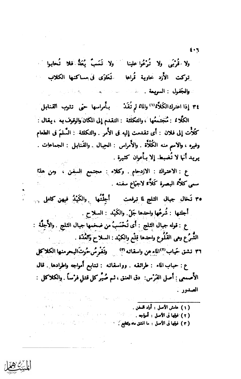 الكَّلاء: مجتمعها، والتكلئة: التقدم إلى المكان والوقوف به، يقال: كلَّأت إلى فلان: أي تقدمت إليه في الأمر. والتكلئة: السِّلم في الطعام وغيره، والاسم منه الكُلاة. والأمراس: الحبال. والقنابل: الجماعات. يريد أنها لا تضبط إلا بأعوان كثيرة.