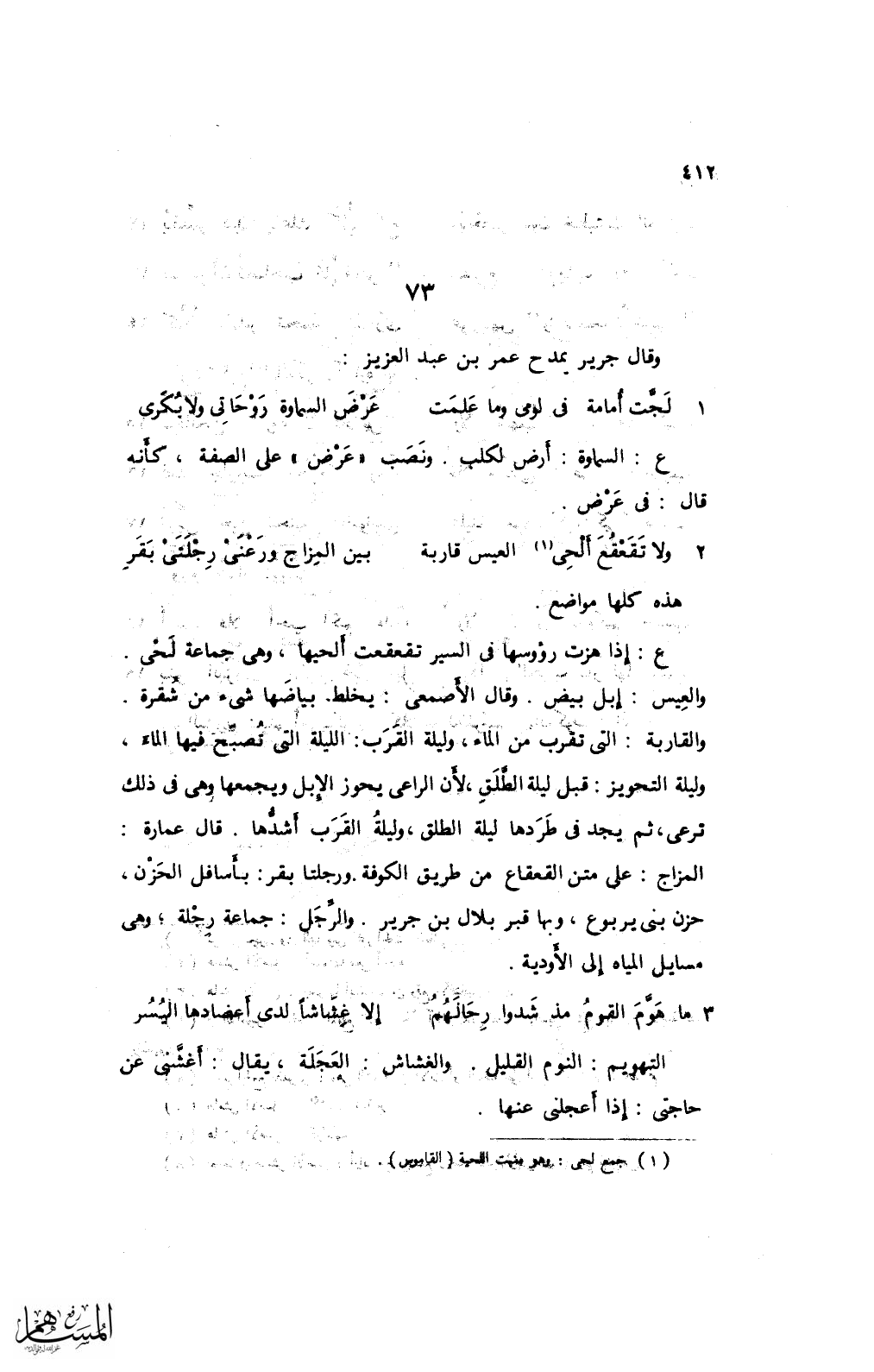 ع: إذا هزت رؤوسها في السير تقعقعت ألحيها، وهي جماعة لحى. والعيس: إبل بيض. وقال الأصمعي: يخلط بياضها شيء من شقرة. والقاربة: التي تقرب من الماء، وليلة القرب: الليلة التي تصبّح فيها الماء، وليلة التحويز: قبل ليلة الطَّلق، لأن الراعي يحوز الإبل ويجمعها وهي في ذلك ترعى، ثم يجد في طردها ليلة الطلق، وليلة القرب أشدُّها. قال عمارة: المزاج: على متن القعقاع من طريق الكوفة. ورجلتا بقر: بأسافل الحزن، حزن بني يربوع، وبها قبر بلال بن جرير. والرِّجل: جماعة رجلة؛ وهي مسايل المياه إلى الأودية.