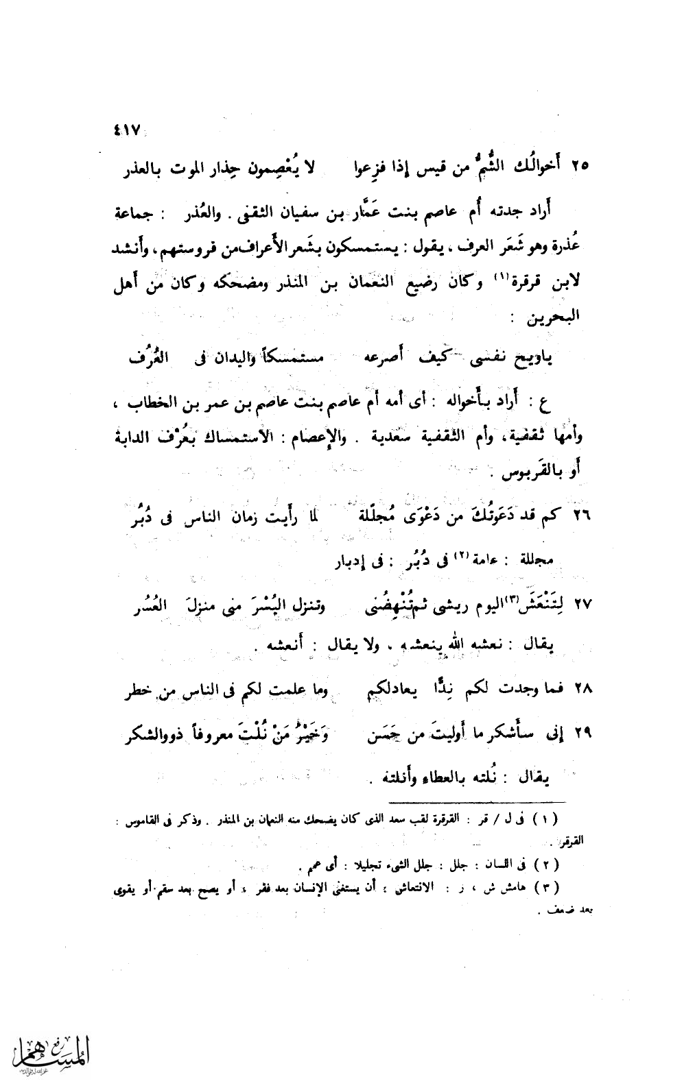 أراد جدته أم عاصم بنت عمَّار بن سفيان الثقفي. والعذر: جماعة عذرة وهو شعر العرف، يقول: يستمسكون بشعر الأعراف من فروستهم، وأنشد لابن قرقرة وكان رضيع النعمان بن المنذر ومضحكه وكان من أهل البحرين: